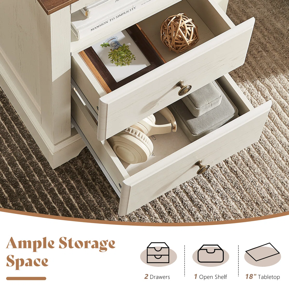 Ample Storage Space: Features 2 drawers and 1 open shelf for books, electronics, or décor items.