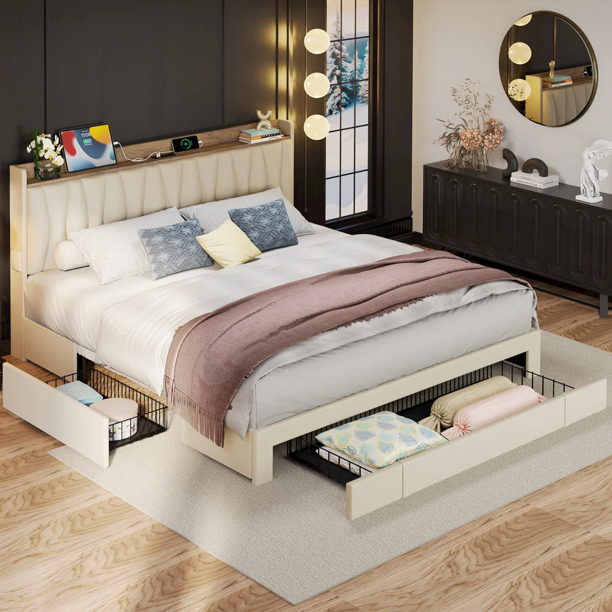 Headboard with charging station for devices and nighttime convenience.