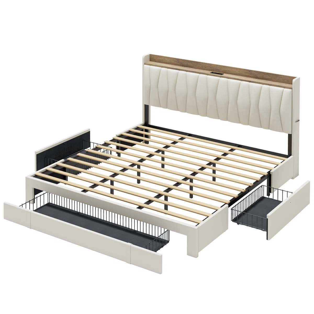 Maximize storage and style with the Ivy Bronx Queen Upholstered Bed Frame, featuring three built-in drawers and a spacious headboard with a convenient charging station. Upholstered in elegant beige fabric, this platform bed combines comfort with practicality, making it perfect for modern bedrooms. Ideal for organizing linens, accessories, or personal items while keeping your devices powered and within reach.