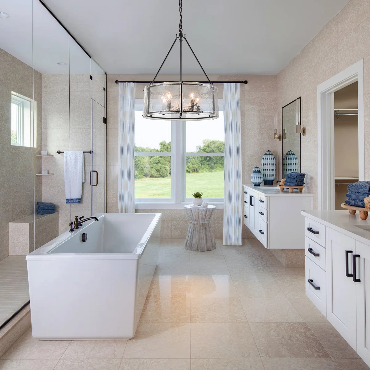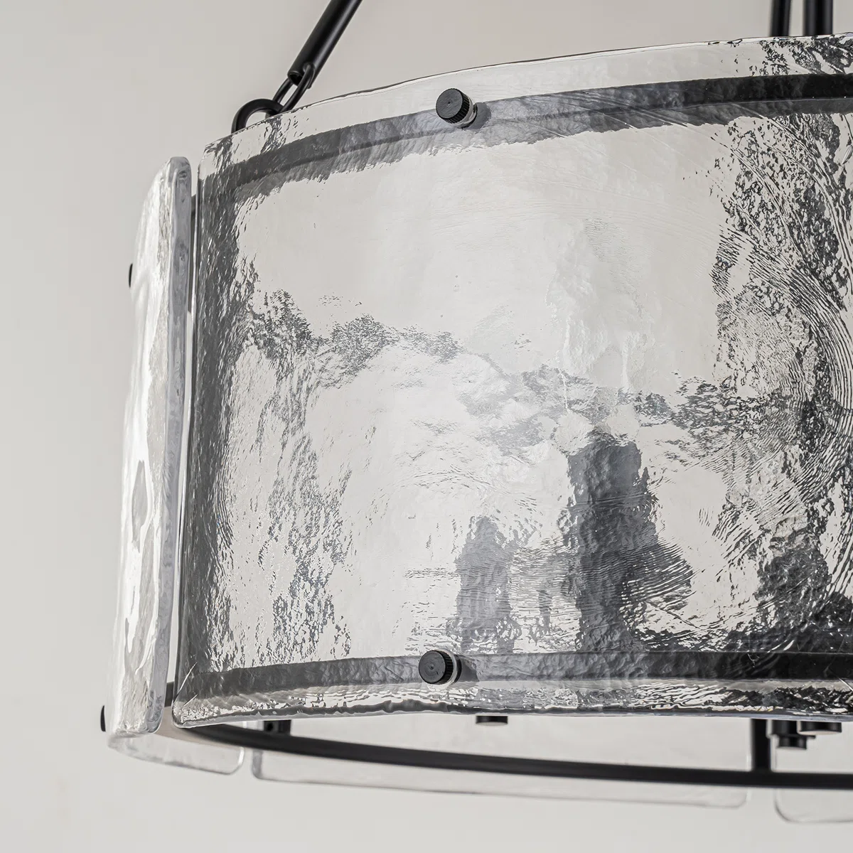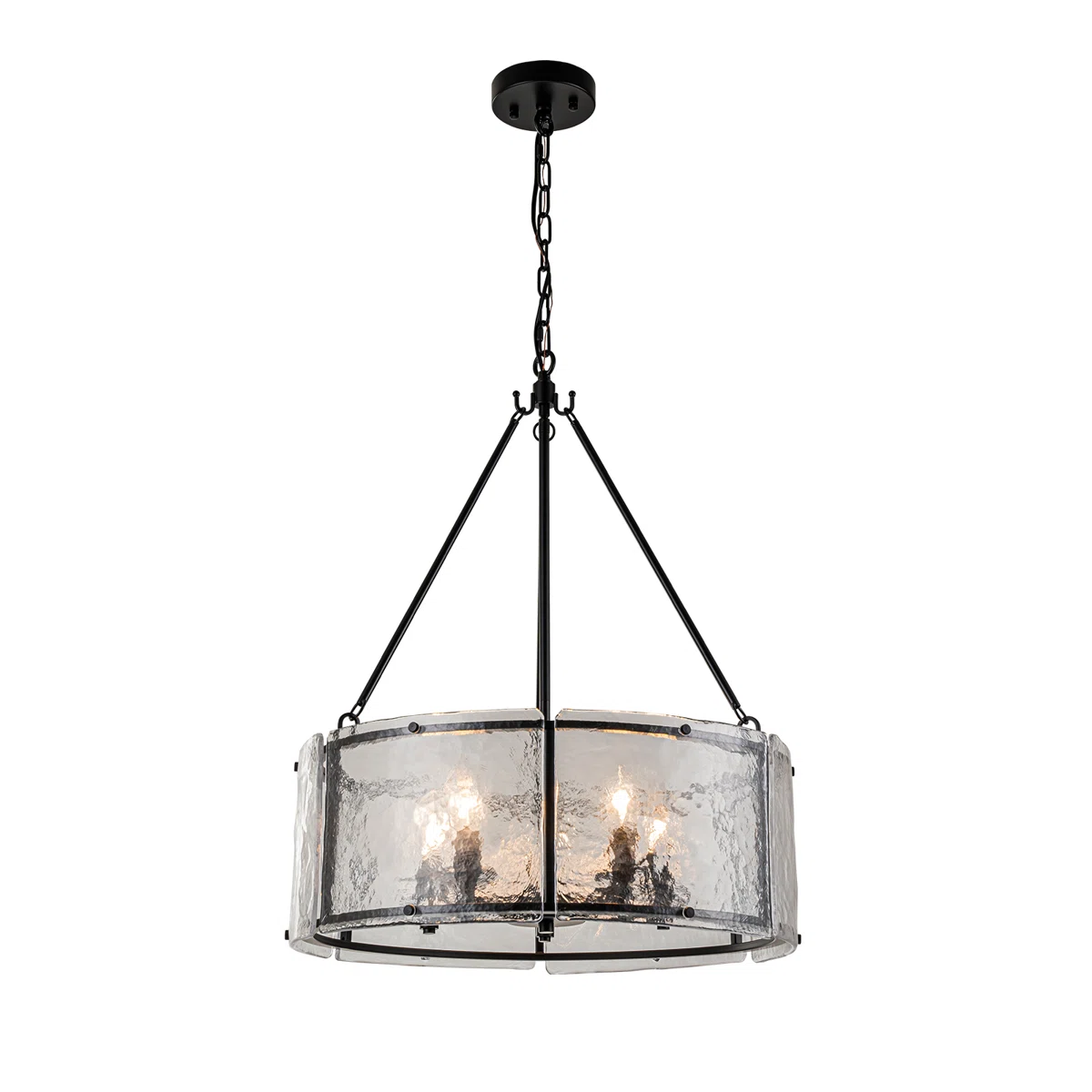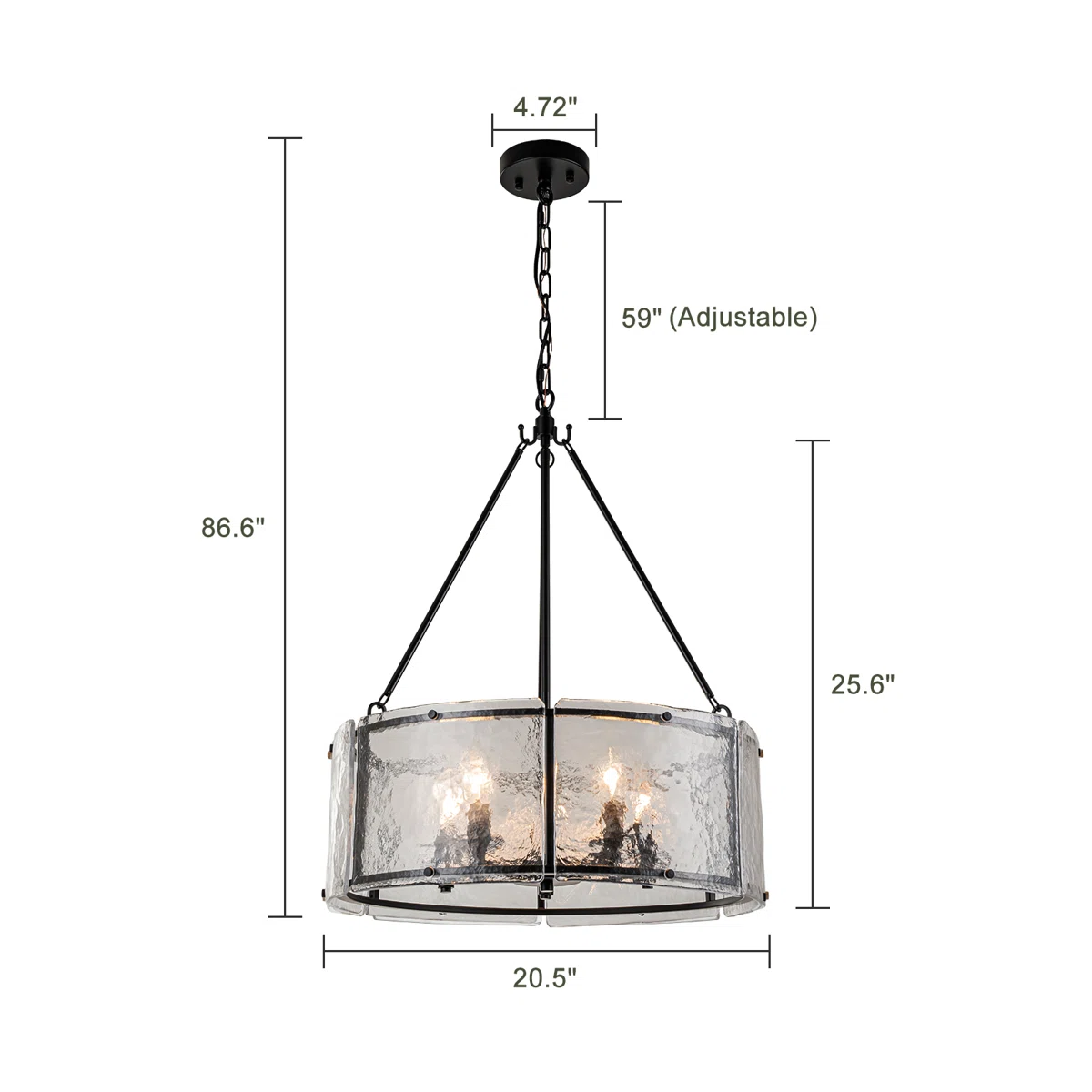 The chandelier features a drum-shaped frame surrounded by six panels of handcrafted water glass, creating a beautiful balance of texture and transparency. When illuminated, the textured glass shades diffuse and soften the light, casting a warm, inviting glow that enhances your dining room, kitchen, foyer, or living space.