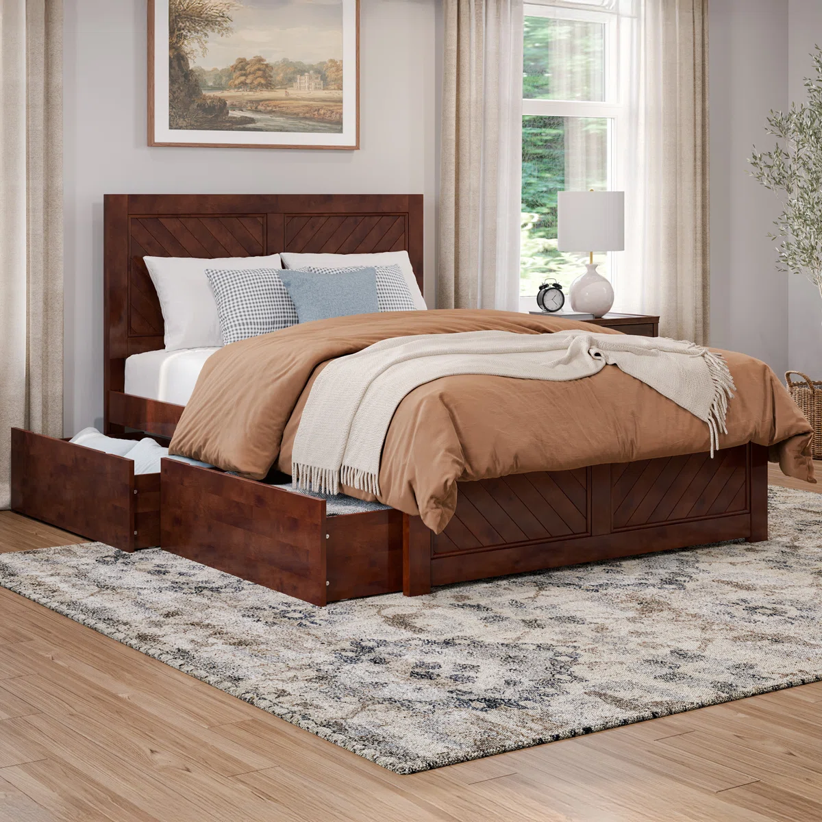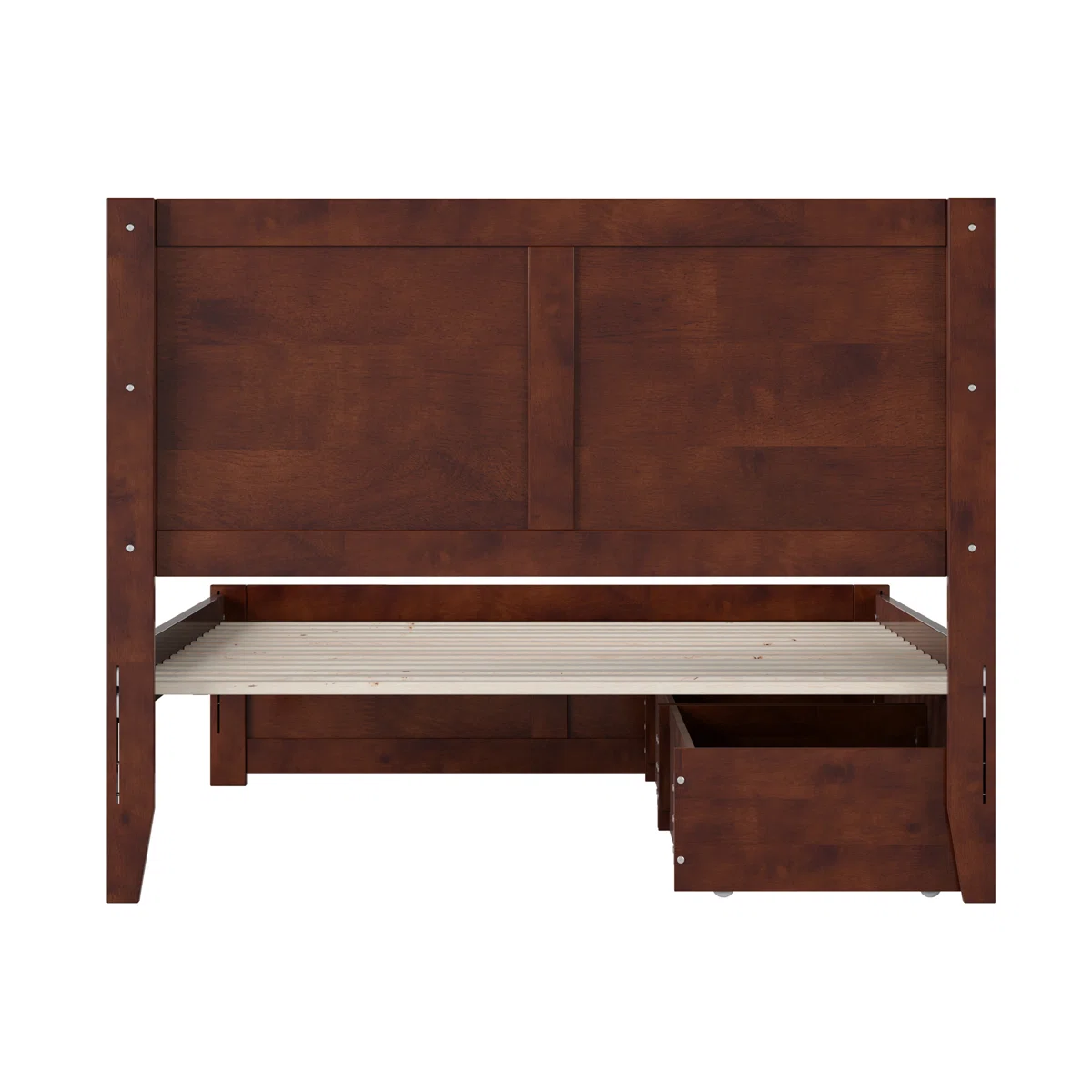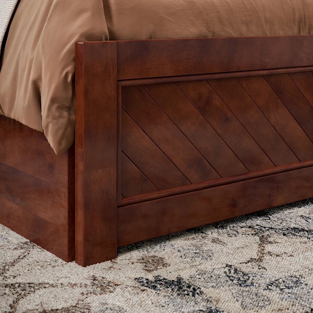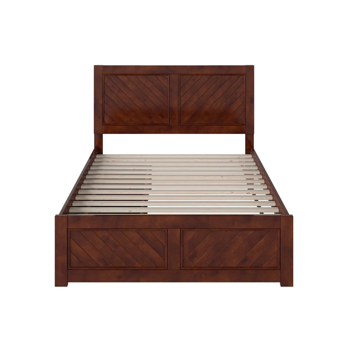 Bring rustic charm blended with modern utility to your bedroom with the Jeinny Solid Wood Platform Bed. Featuring a robust solid-wood frame and matching footboard in a rich walnut finish, this platform bed includes built-in drawers for additional storage and eliminates the need for a box spring. Chevron carving details on the headboard and footboard add artisanal character, while the generous under-bed clearance and included slat kit ensure strong mattress support.