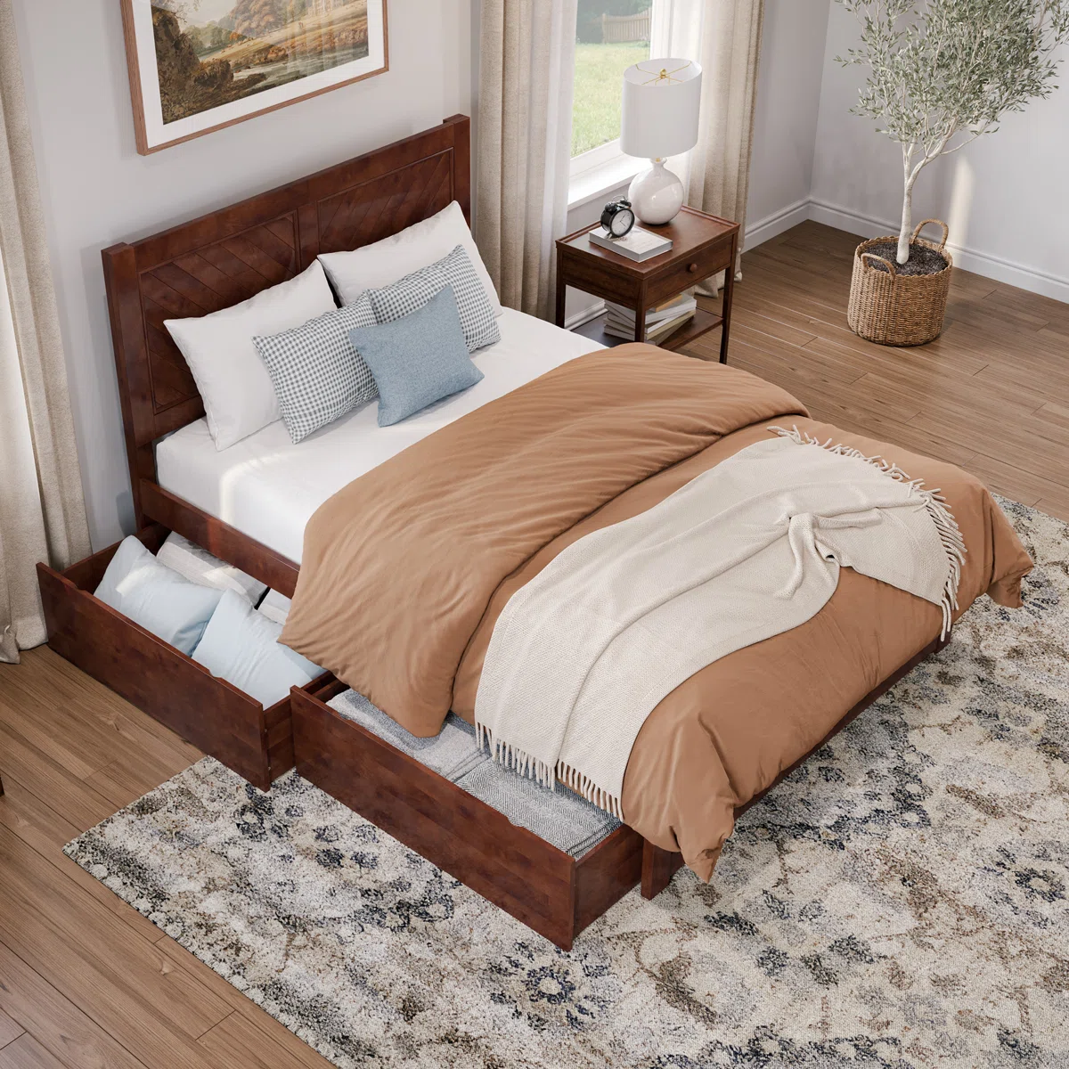 Two spacious built-in storage drawers integrated into the frame to maximize bedroom organization.