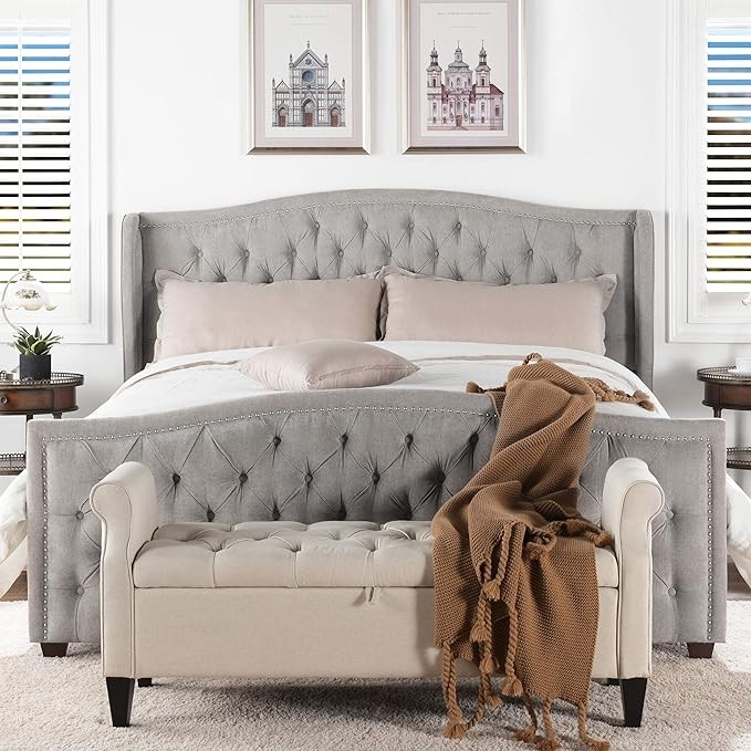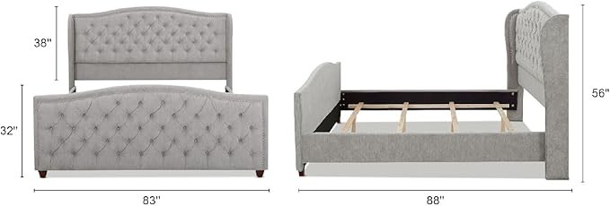 Upholstered in premium silver grey polyester fabric, the Anastasia bed features a high shelter-style headboard and elegant hand-applied nailhead accents in a satin silver finish, offering both luxury and timeless design. The set includes a cream-colored footboard, side rails, U-support rail, and fitting box, completing a cohesive and refined look.