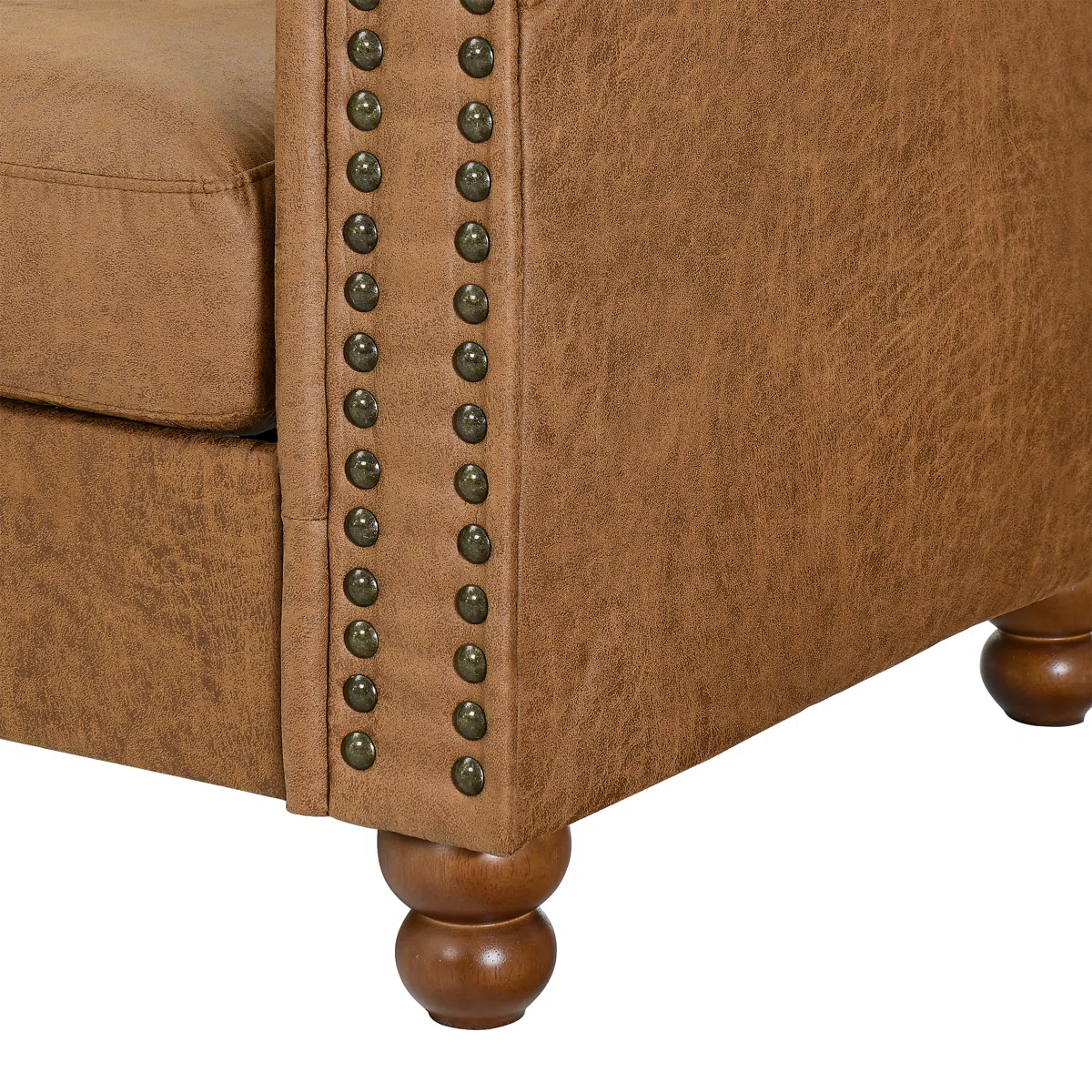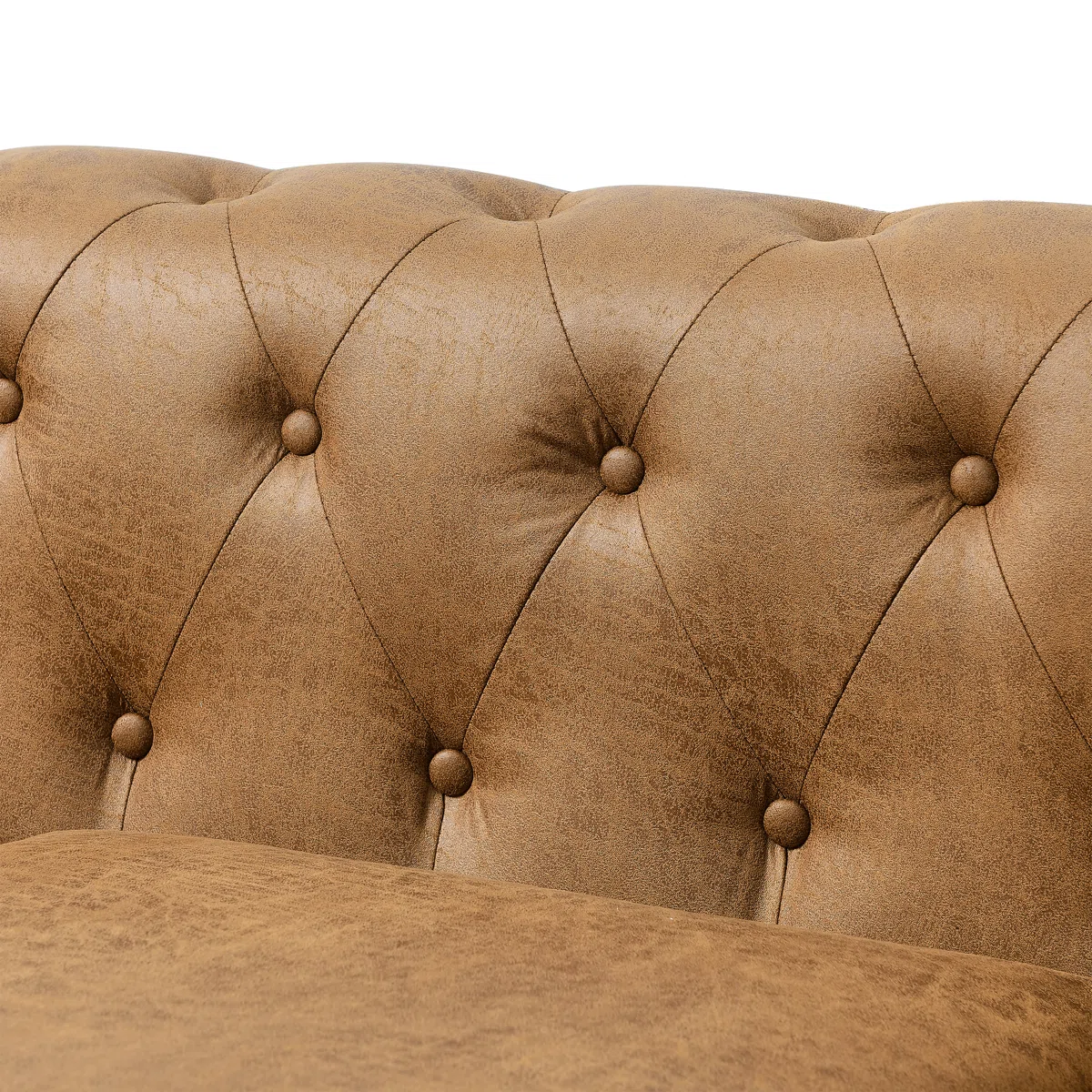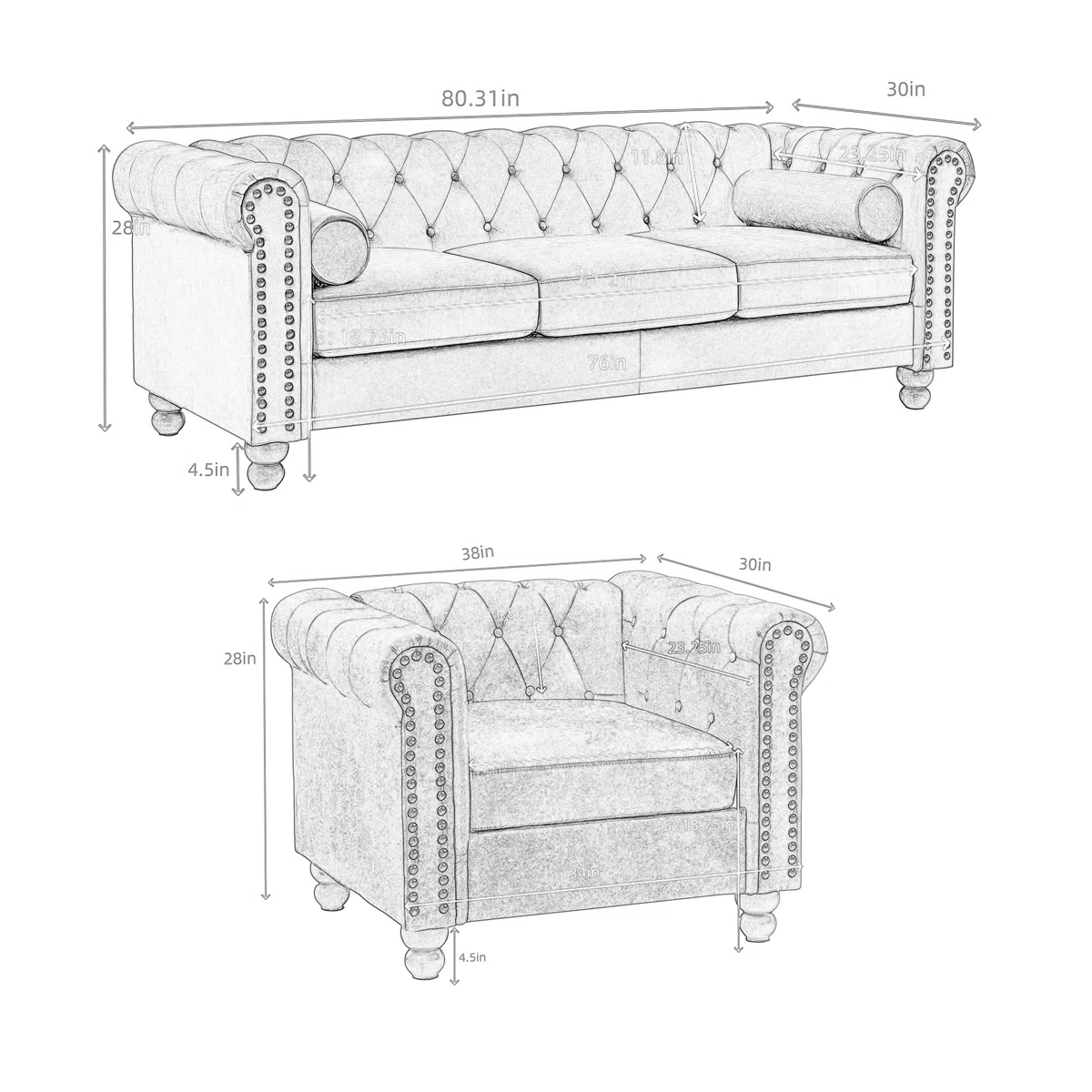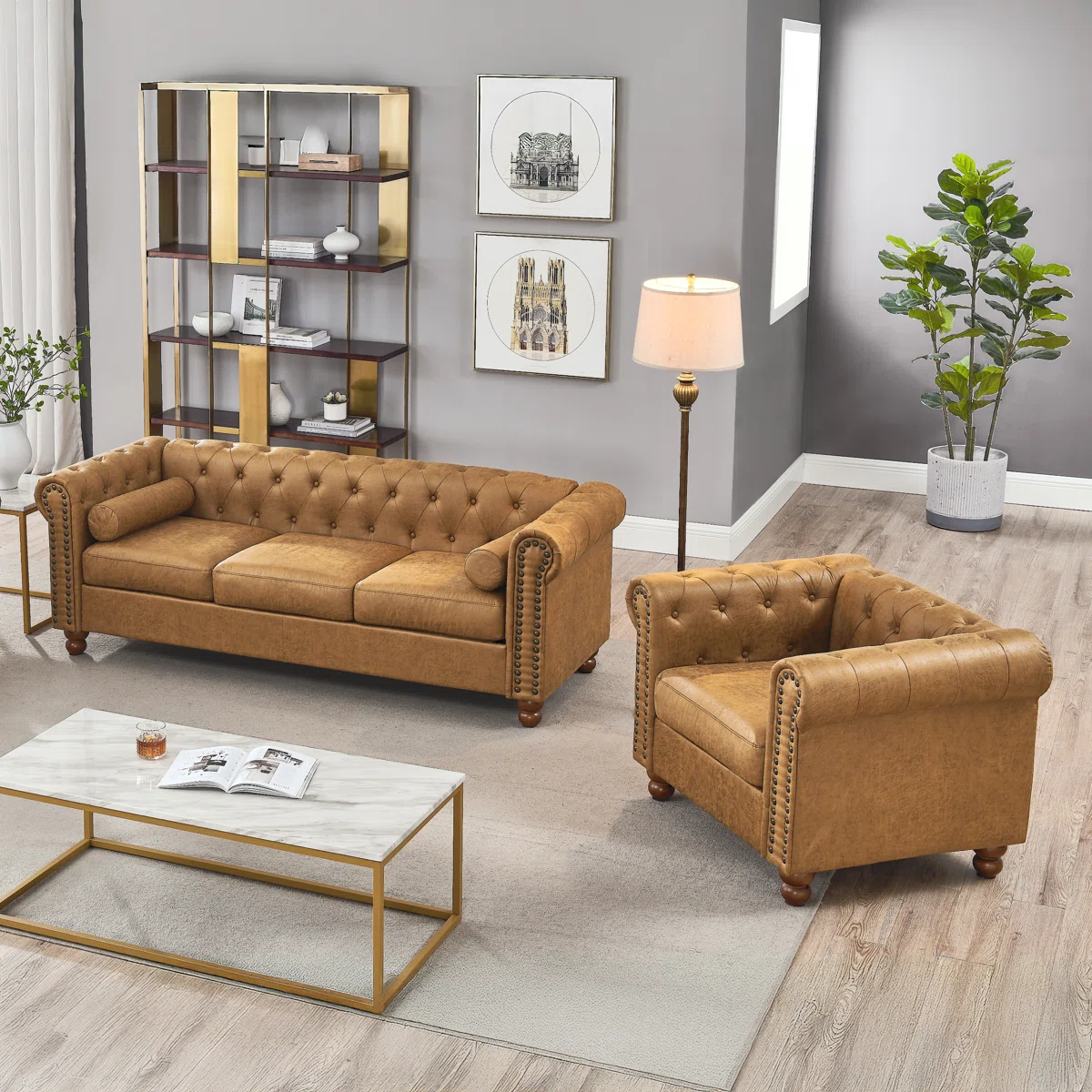 The Jhosep 2-piece living room set brings classic Chesterfield charm blended with modern comfort. Featuring a 3-seater sofa and matching single chair, this set is upholstered in breathable, durable faux air leather that mimics genuine leather while offering easy maintenance and a soft touch. The button-tufted backrest, rolled arms, and nailhead trim add timeless elegance, while the low-profile design makes the set suitable for compact spaces like apartments, dorms, studios, and small living rooms. Supported by a solid wood frame and foam cushioning, the set provides long-lasting comfort, style, and resilience.