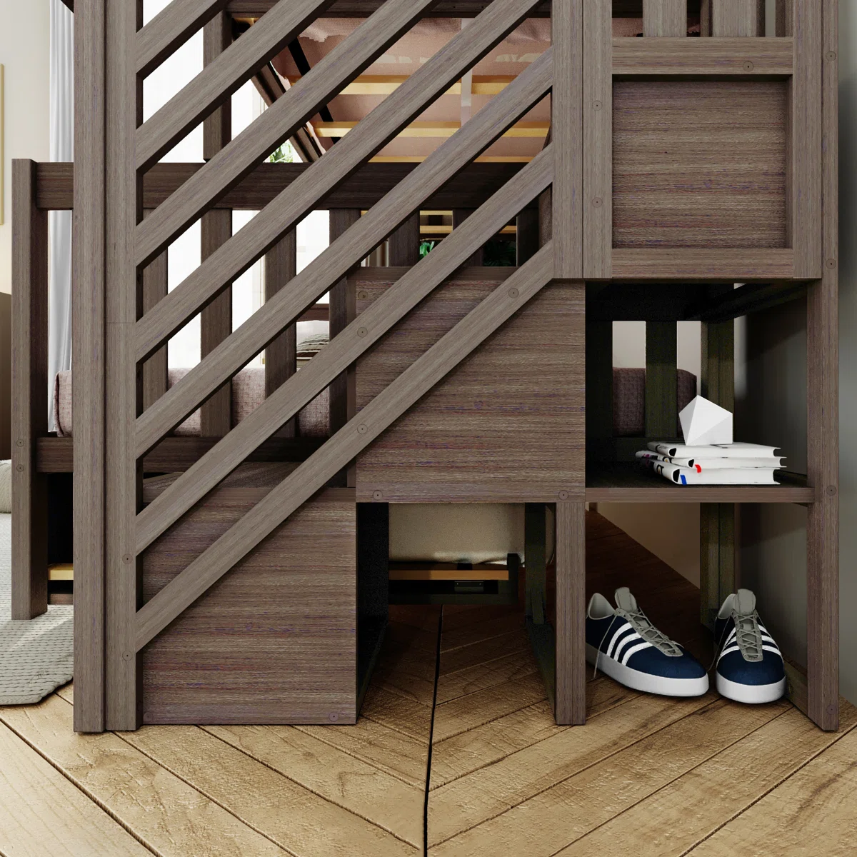 The trundle bed provides extra sleeping space for sleepovers or guests, while hidden storage and a built-in shelf add organization and convenience. Designed to meet or exceed federal safety standards, this bunk bed is an ideal solution for maximizing space in smaller rooms while maintaining comfort and style.