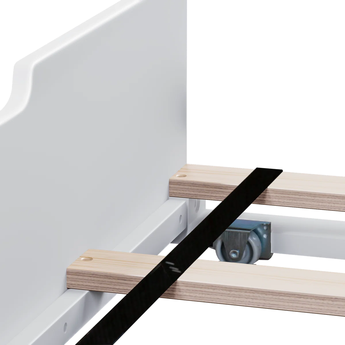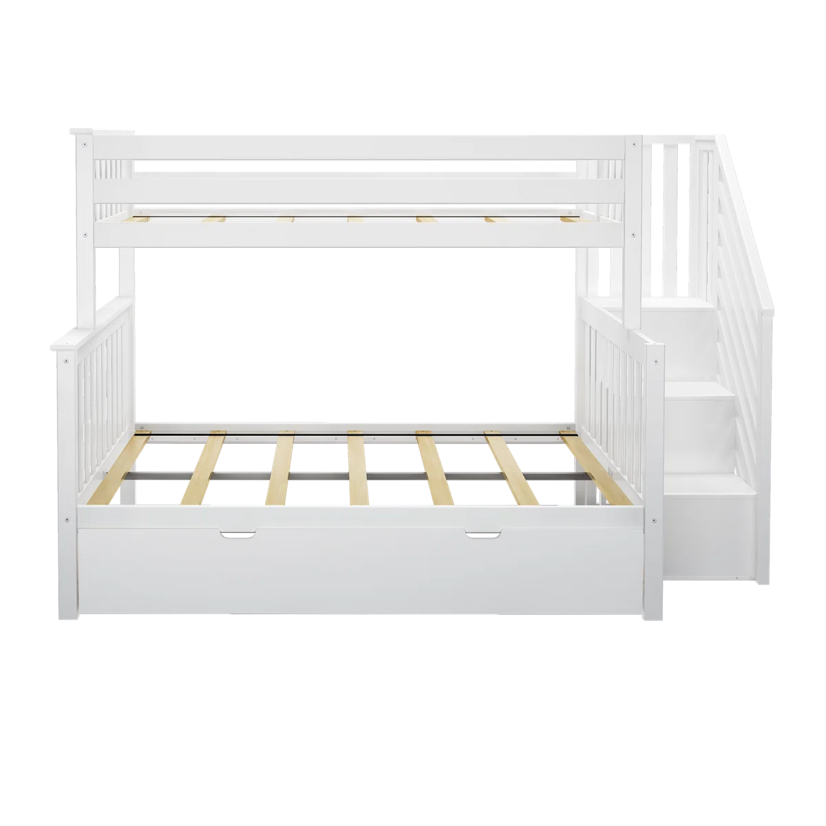 When it's time to move out of the nursery and into kid-sized furniture, this kid's furniture brings the style, quality, and affordability that families want. This best-selling staircase bunk with a trundle design is great for smaller rooms, opening up lots of floor space for play. This bed features a popular staircase design with banisters for extra safe, comfortable climbing. The staircase is reversible so it can be installed on the left or the right upon assembly. Easy to maintain and long-lasting low VOC finish. Flush, color-matching hardware for a clean look. This bed meets or exceeds federal safety standards for children’s furniture. Instructions, slat roll, tool, and required hardware are included. 2+ adults make assembly easier. The bed ships in one box and is heavy due to solid wood construction.
