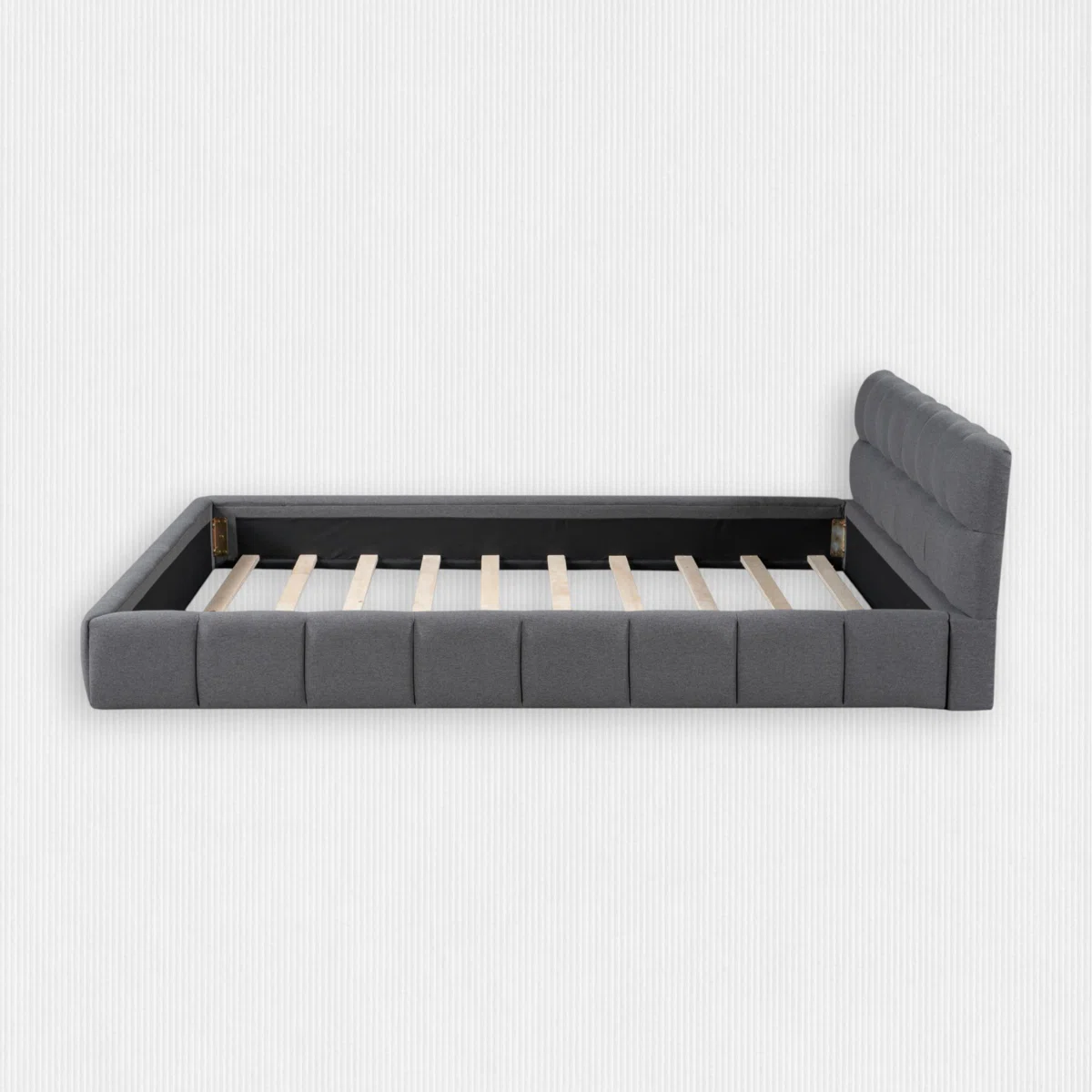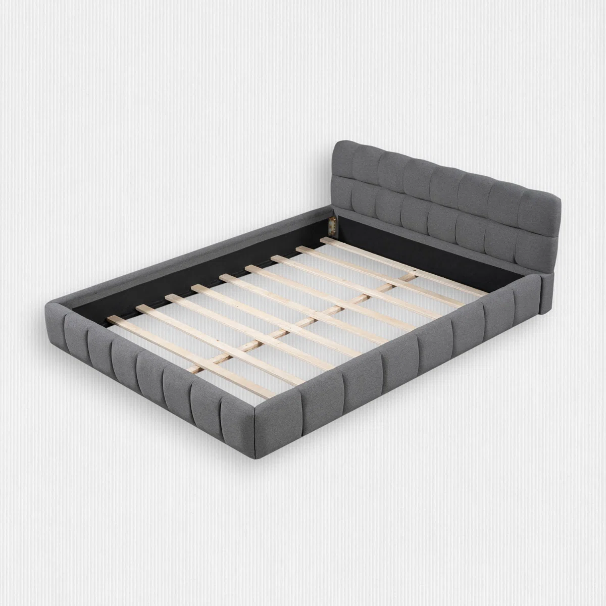 • Queen platform bed with upholstered headboard, footboard, and side rails in premium gray linen