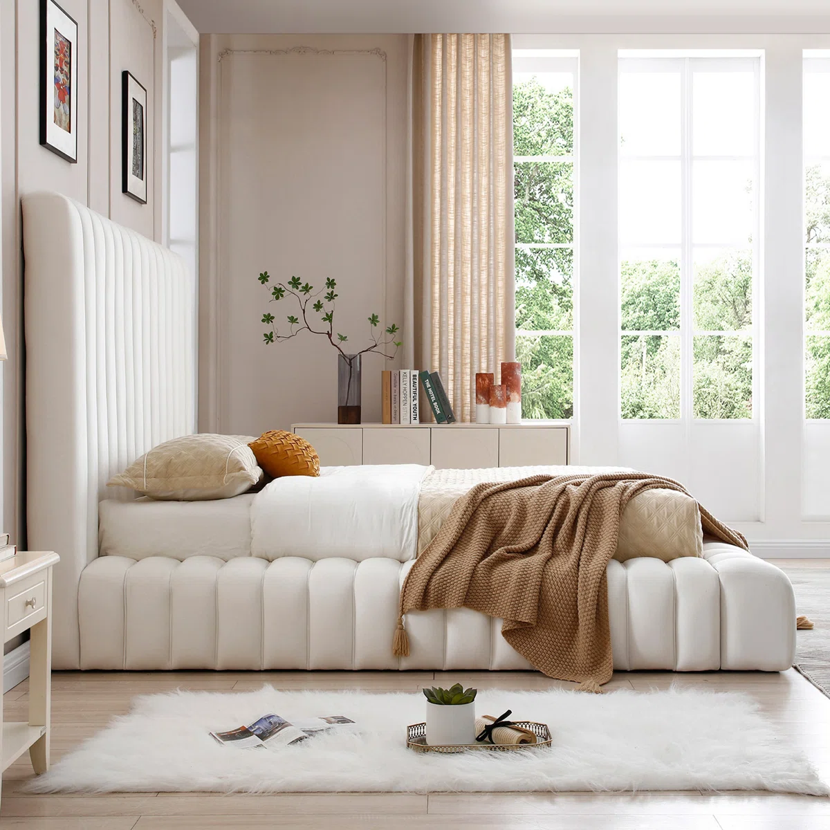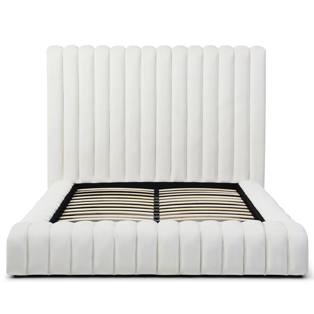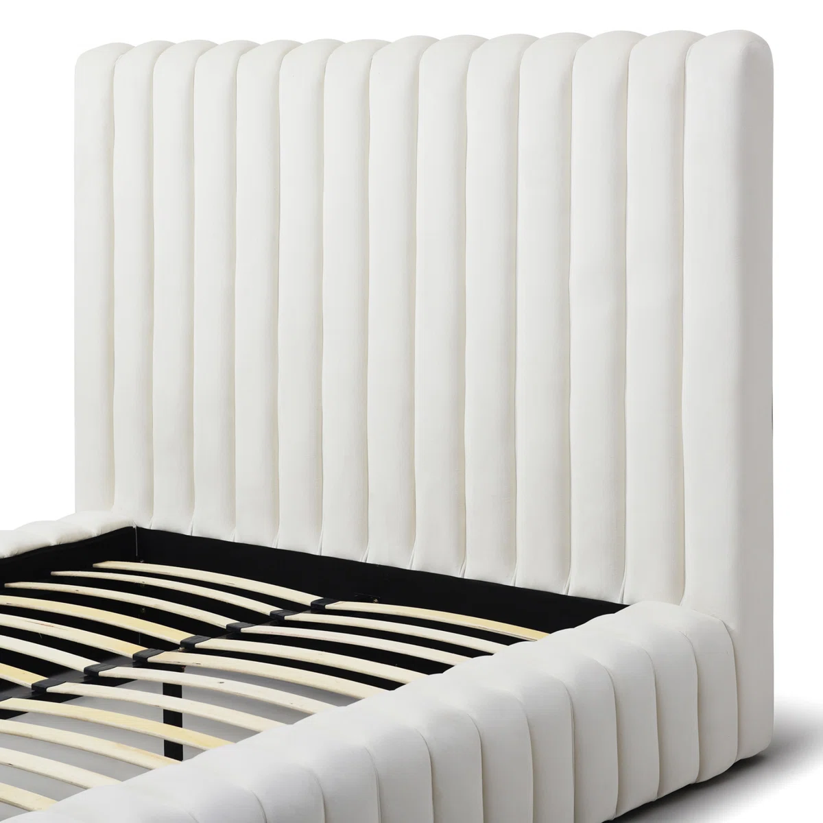 The Everly Quinn Kaydence Velvet Platform Bed brings comfort, elegance, and refined visual appeal to any bedroom. Wrapped in plush, foam-filled velvet upholstery, this king-size bed creates a soft and luxurious atmosphere. The vertically piped headboard adds a sophisticated design touch, while the low-profile structure ensures easy access and a clean modern look. Built with a durable metal frame, 39 solid wood slats, and four center support legs, this platform bed provides exceptional stability with an 800 lb. weight capacity. No box spring is needed. Assembly is quick and simple with all tools included.