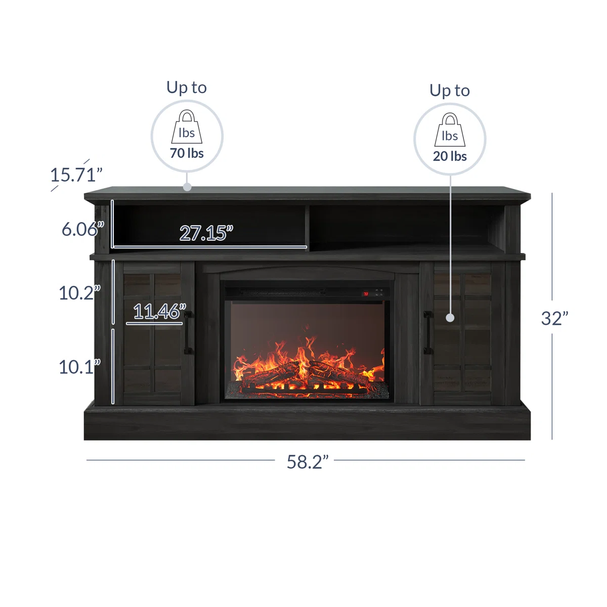 Bring warmth and style to your living room with the Kehaulani 65" Media Console TV Stand with Electric Fireplace. Designed to accommodate TVs up to 65", this elegant console combines rustic charm with modern functionality. The built-in 1400W electric fireplace warms spaces up to 400 sq. ft., complete with realistic glowing embers and crackling sound for an immersive experience without smoke or ashes. Constructed from durable manufactured wood with tempered glass cabinet doors and metal hardware, it provides ample storage with adjustable shelves, open shelving, and cable management cutouts for a clutter-free setup. Ideal for contemporary homes seeking both aesthetics and practicality.