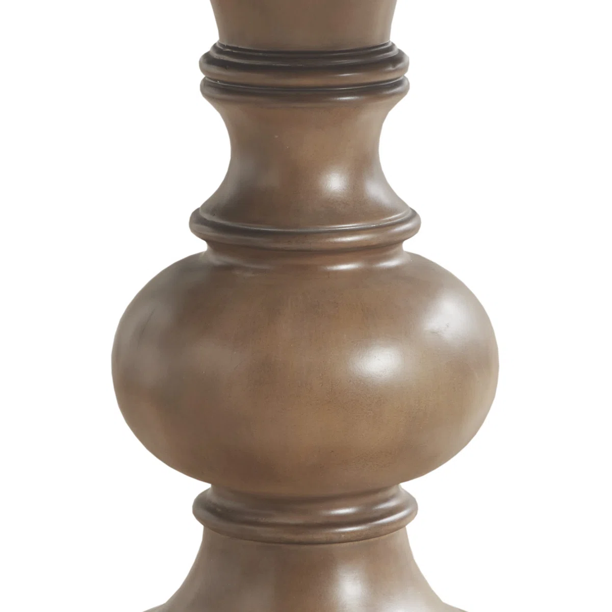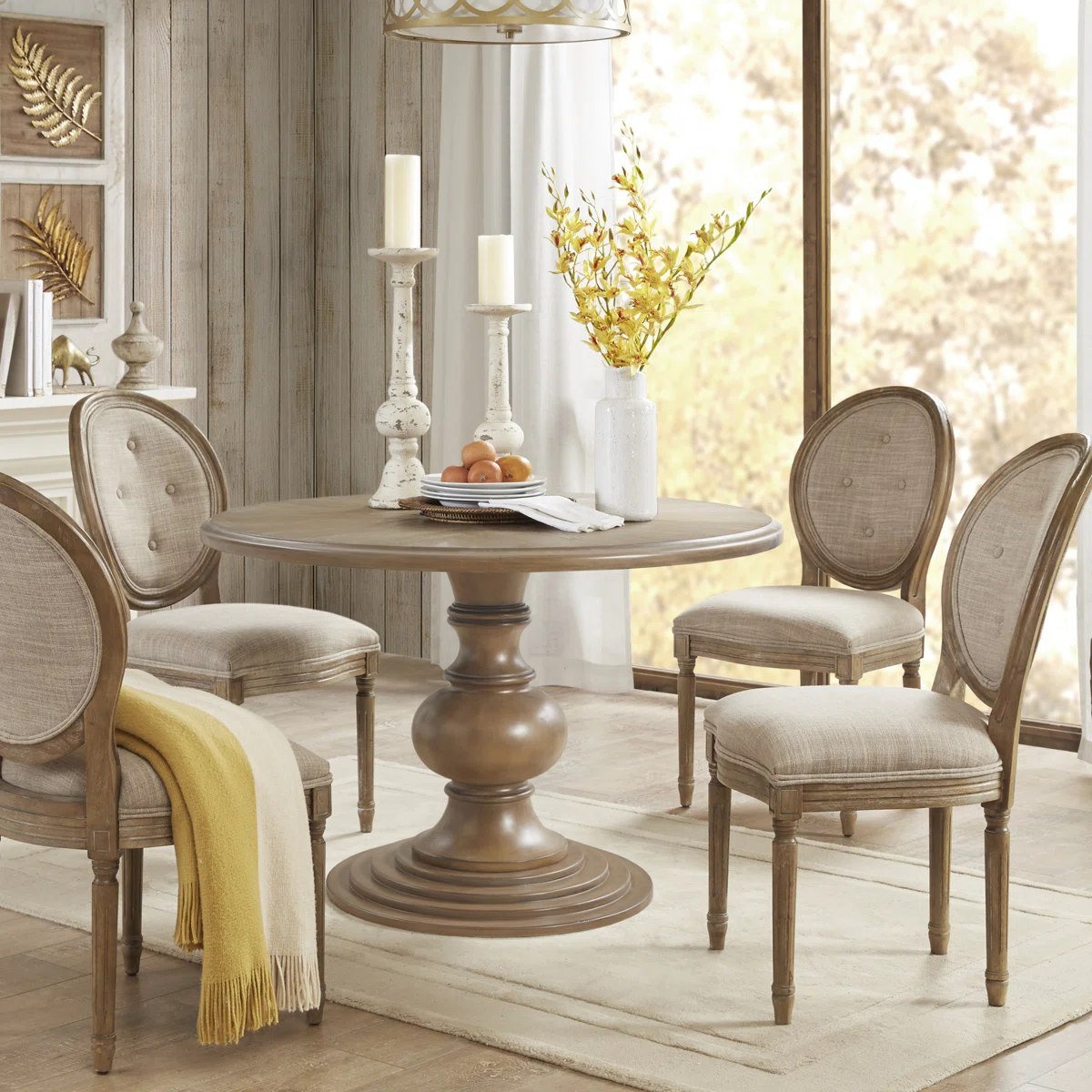 Pedestal base gives unobstructed leg space and a clean farmhouse silhouette.