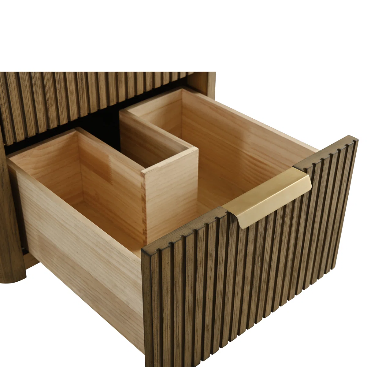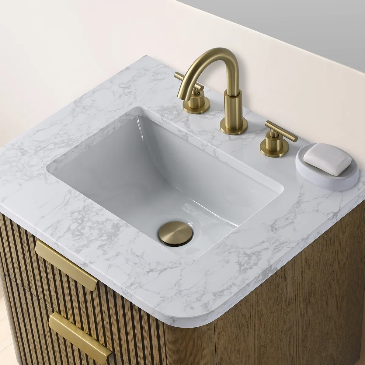 The Arabescato engineered stone top provides a crisp, elegant surface paired with a centered undermount ceramic sink for seamless functionality. Storage is smartly organized with a soft-close full-extension drawer and flip-down tray, keeping toiletries and daily essentials neatly tucked away yet easily accessible. Brushed bronze or nickel hardware adds a refined, modern touch to complete the design.