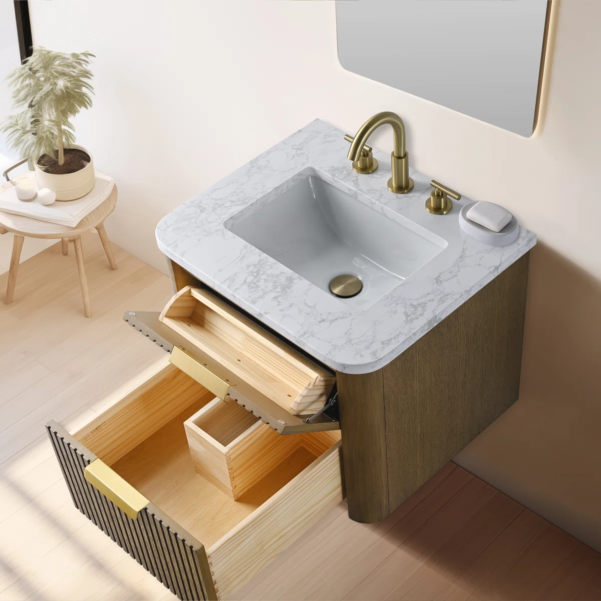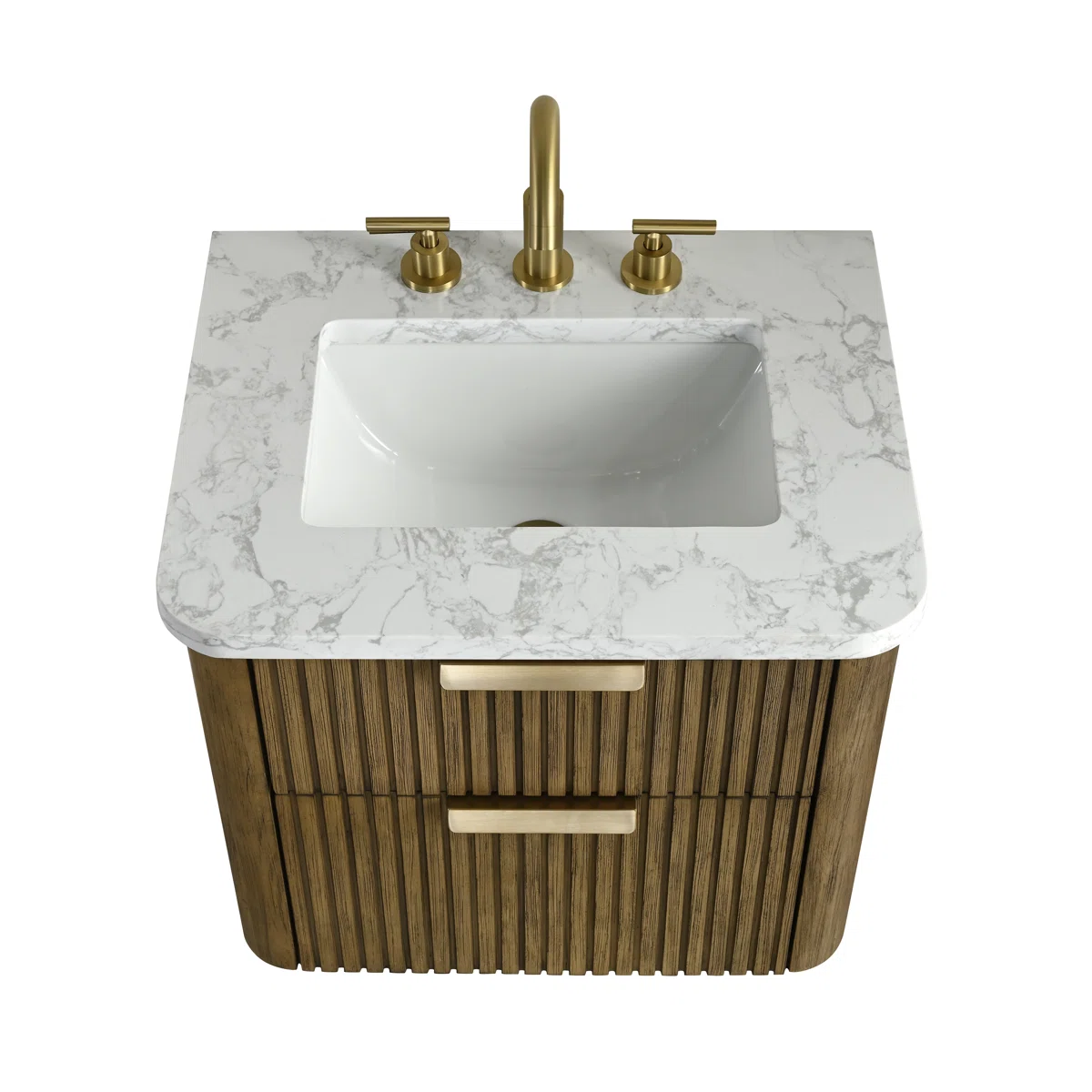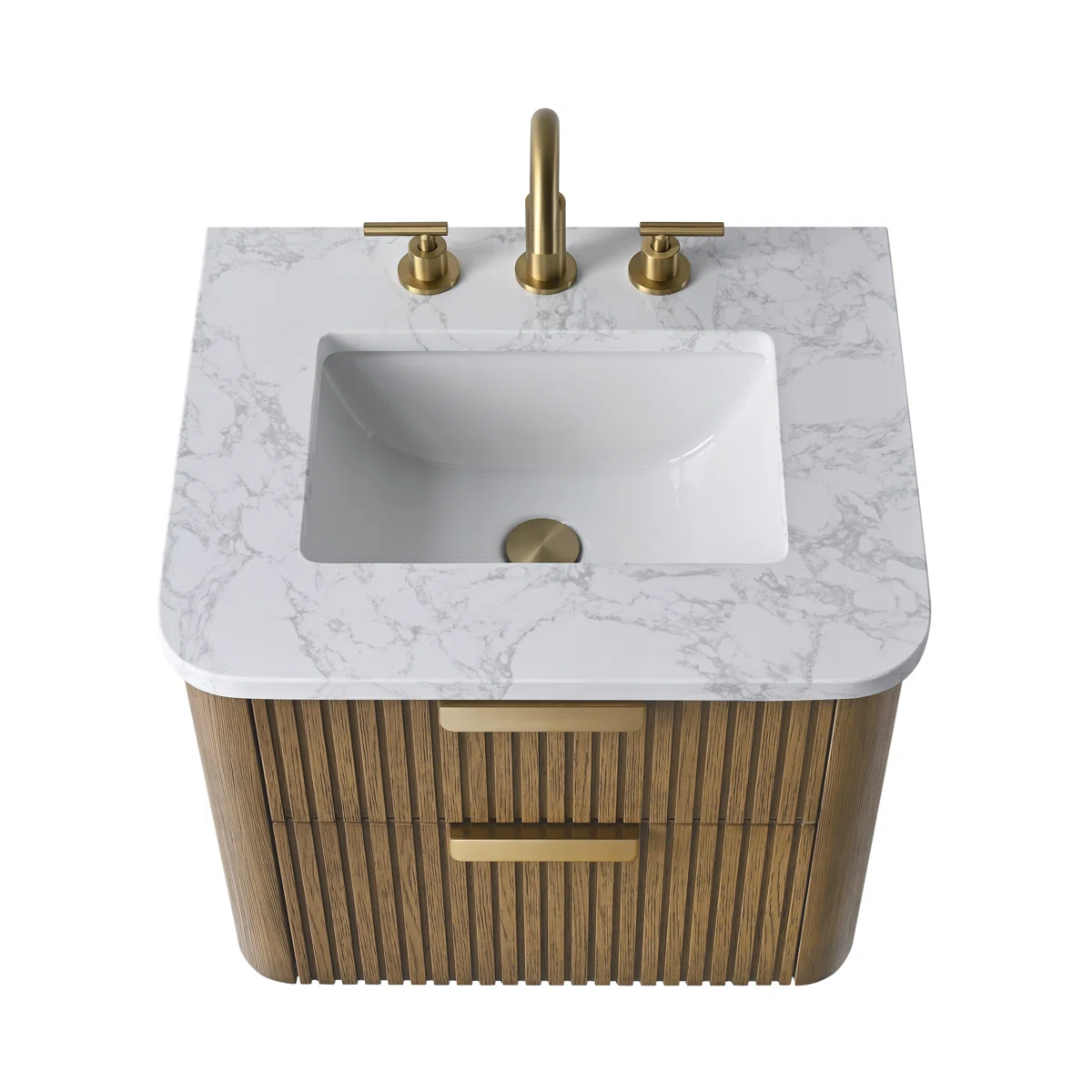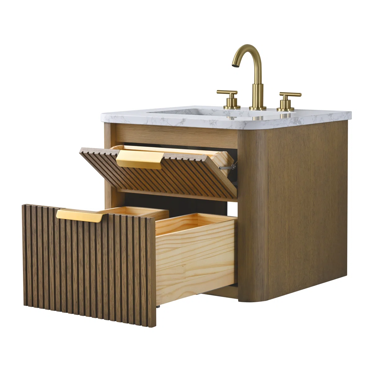 Elevate your bathroom with the Liljan 24" Wall-Mounted Single Bathroom Vanity, designed for modern spaces that demand both style and efficiency. Featuring a floating slatted wood base, this compact vanity creates the illusion of more space while maintaining a sleek, contemporary look.