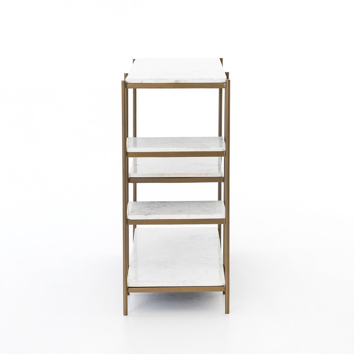 Add a pop of elegance to your living space with the LILY Console Frame. Featuring a polished white marble top paired with a slim iron frame finished in antique brass, this console table effortlessly blends sophistication with modern lines. The design includes multiple slightly askew shelving sections to enhance visual interest and functionality while maintaining a sleek profile.