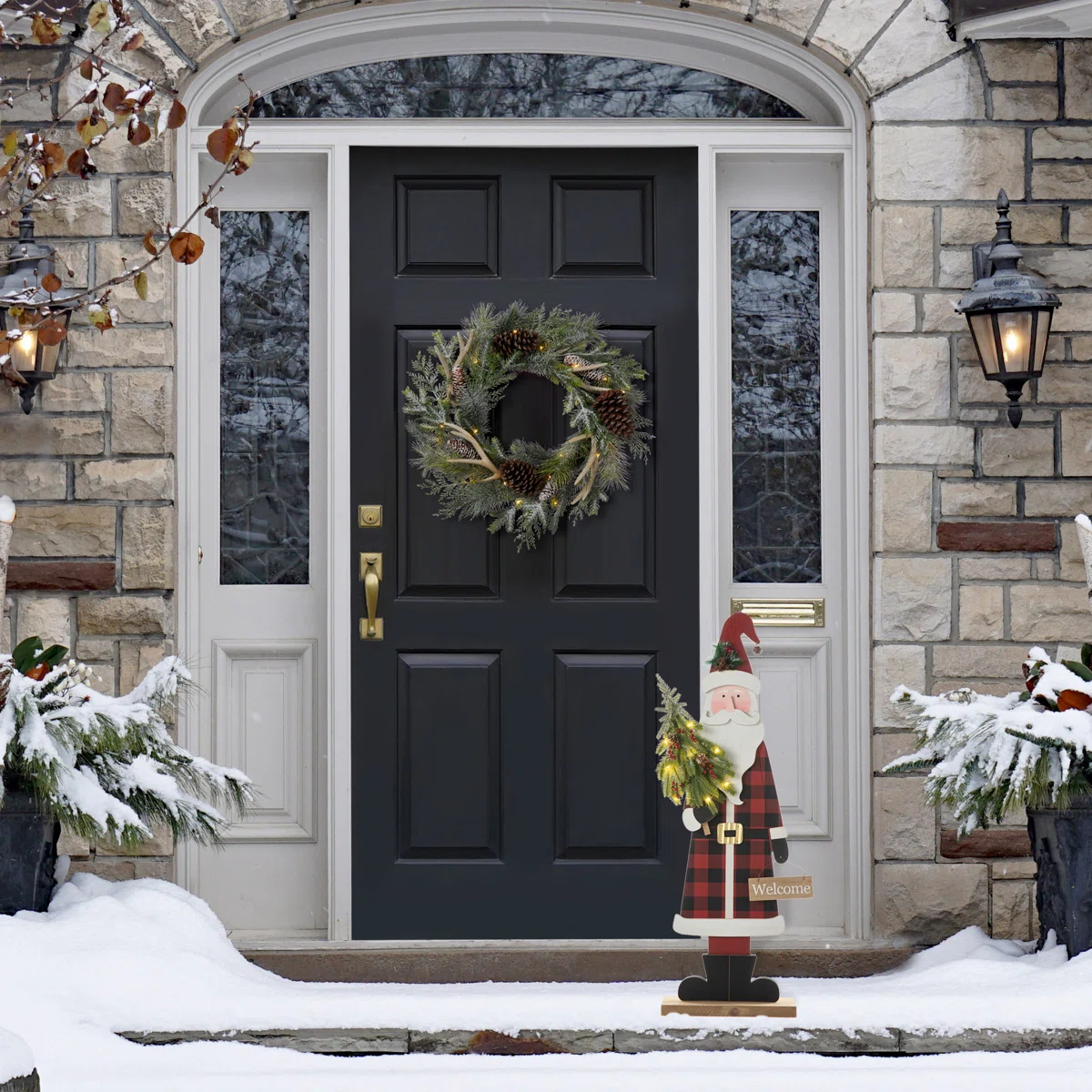 Bring holiday cheer to your entryway or porch with this charming Lindia Lighted Wooden Christmas Santa décor piece. Standing at 36″ tall, Santa is crafted from wood and finished in classic red, white, and black with plaid accents and a nostalgic bell-topped hat. He’s outfitted with nine built-in warm-white LED lights and powered by AA batteries (not included), making him an inviting and illuminated welcome sign for the season. The sturdy wooden base gives him stable placement inside or on a covered porch.