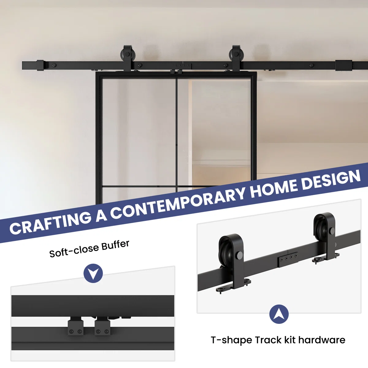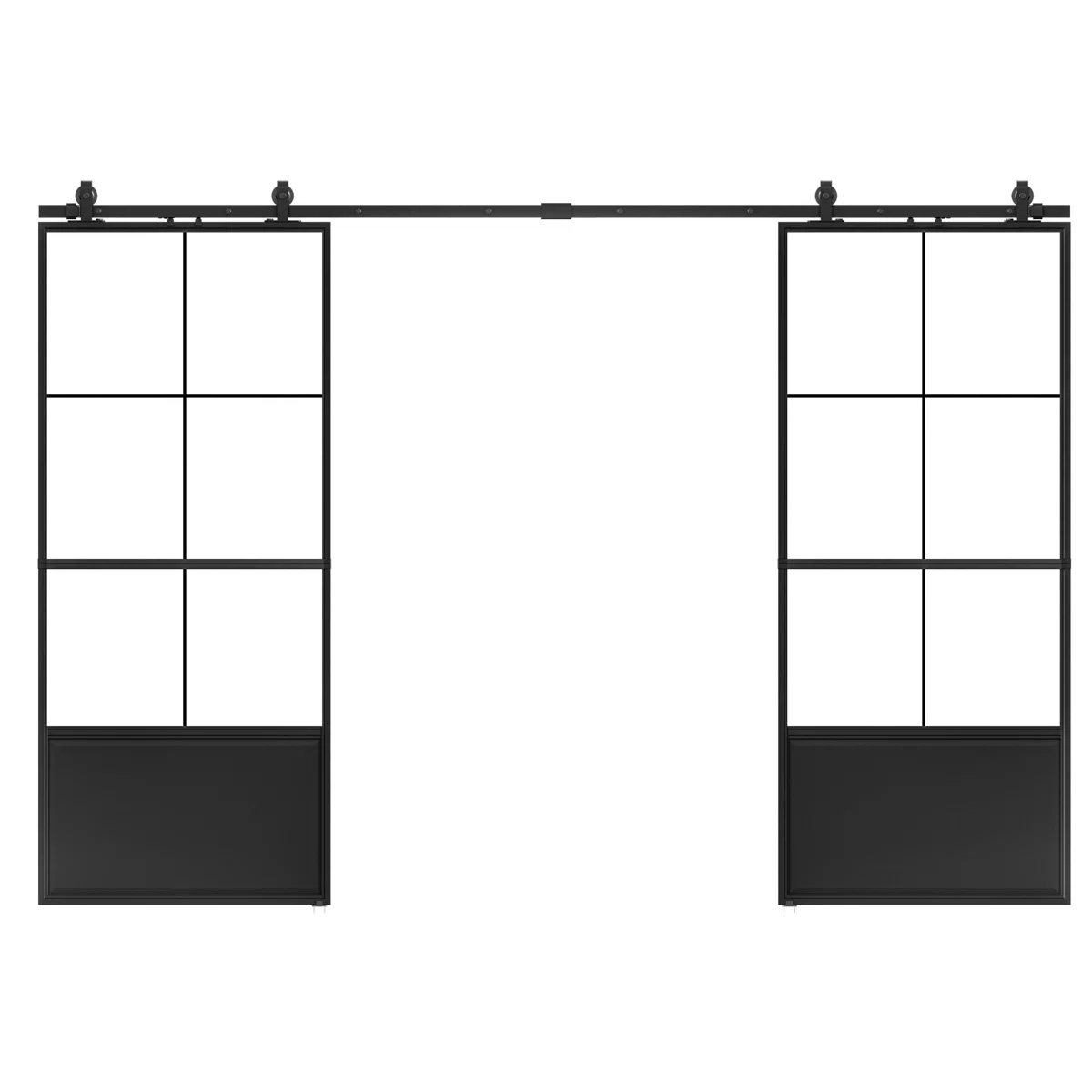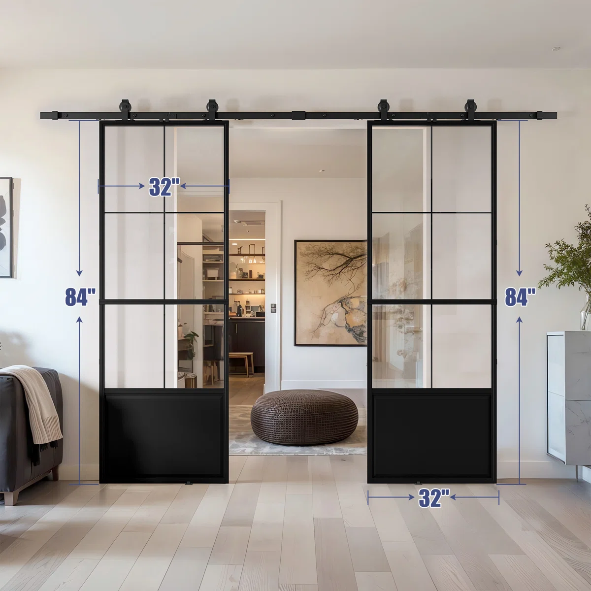 Upgrade your interior spaces with the DoorFusion Metal and Glass Double Barn Doors. Combining a sleek black metal frame with tempered glass panels, these doors offer contemporary style with durability and security. Perfect for closets, bathrooms, pantries, laundry rooms, bedrooms, kitchens, offices, and basements, this set includes all necessary hardware and a soft-close buffer for smooth operation. Each door is shipped disassembled for safe transport and requires assembly. Rust-resistant powder coating ensures long-lasting aesthetic appeal, while the sliding design maximizes space efficiency. Easy to install with pre-drilled holes, this set provides a functional and stylish solution for high-traffic areas.