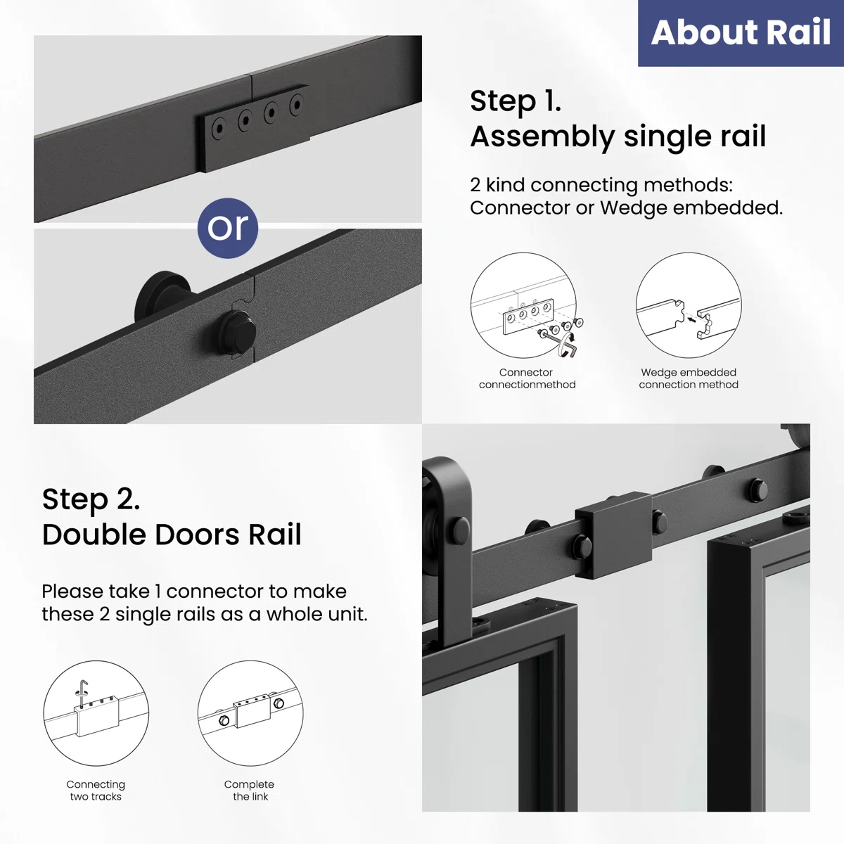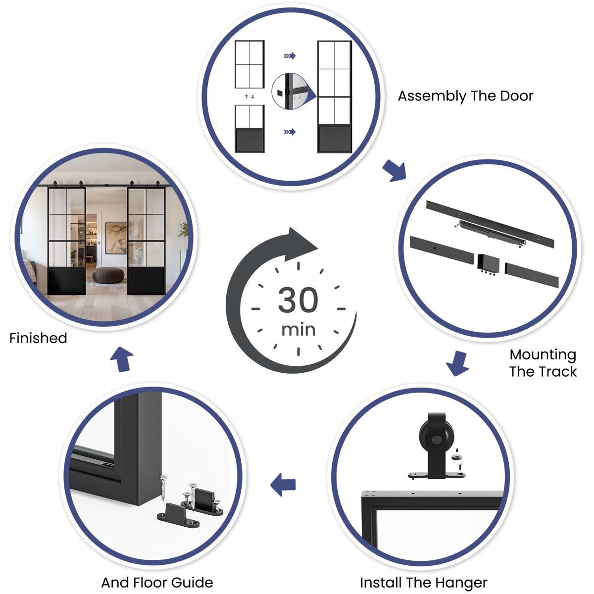 • Set includes 2 metal and glass barn doors with installation hardware kit and soft-close buffer