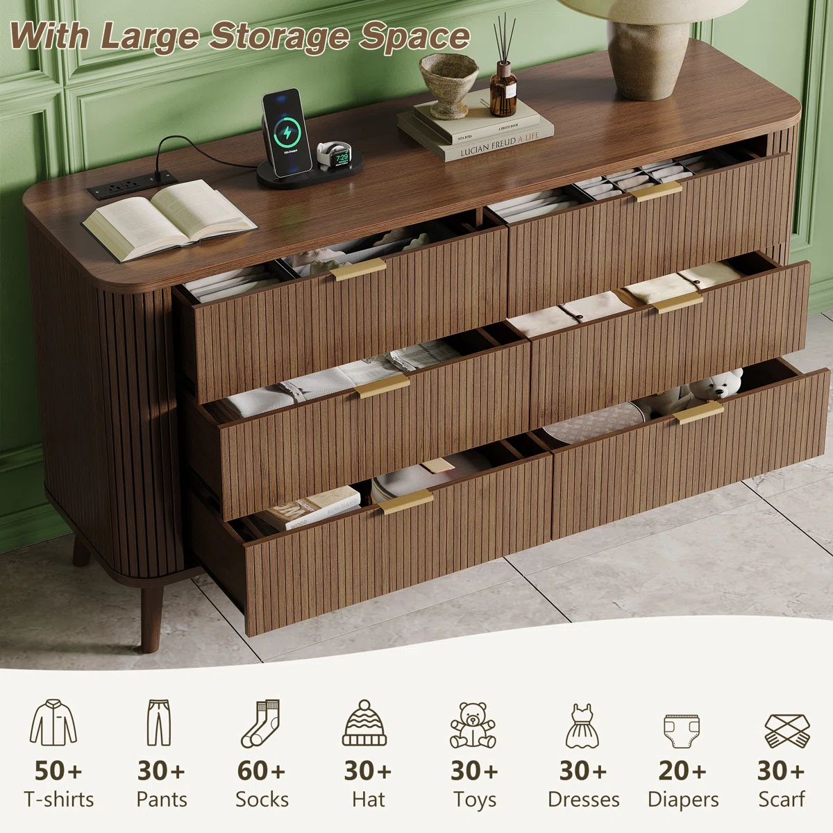 • 6 spacious drawers with smooth glide mechanisms for organized storage