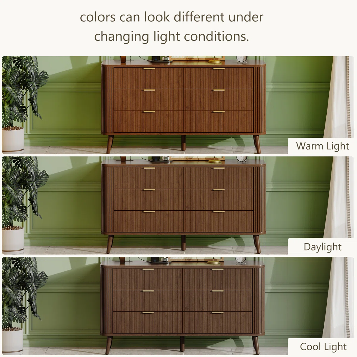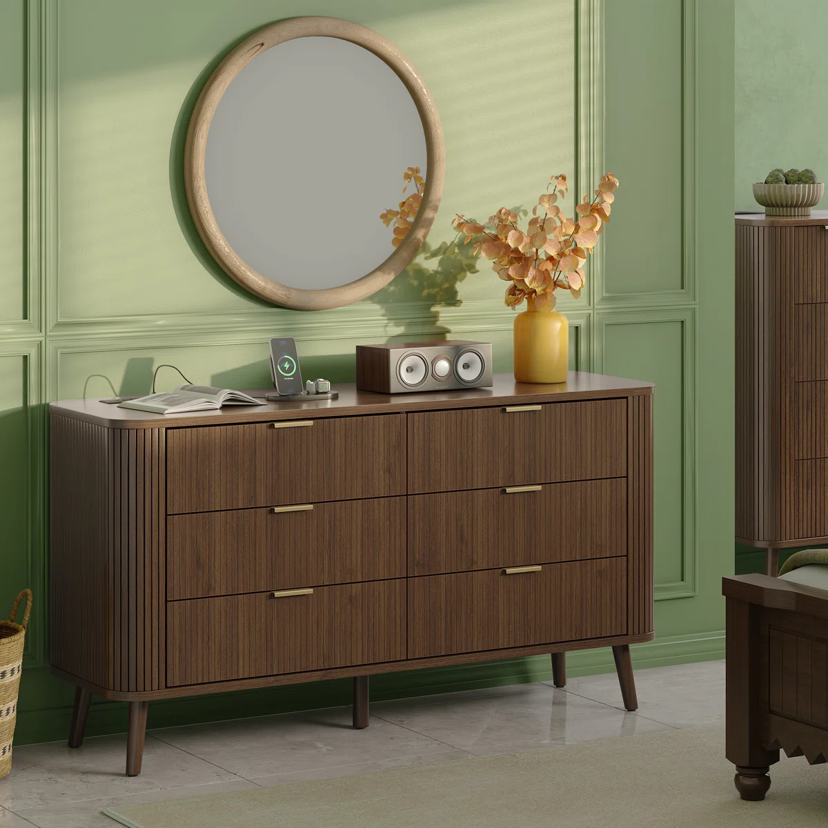 Elevate your bedroom or living space with the George Oliver 6-Drawer Dresser, a perfect blend of style and functionality. Featuring a fluted side panel and drawer design with tapered wood legs, this mid-century modern dresser adds texture and linear elegance to any room. Crafted from high-quality materials, it provides durability and long-lasting performance. Six spacious drawers offer ample storage for clothing, accessories, or media, while smooth-glide mechanisms ensure effortless access. Ideal for bedrooms, living rooms, hallways, or entryways, this dresser also doubles as a stylish TV stand. Easy assembly is included with all tools and instructions.