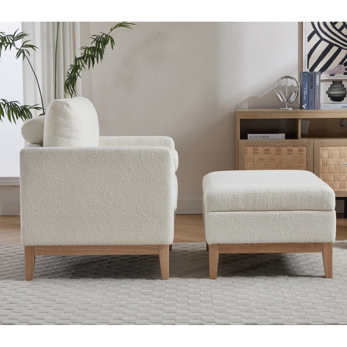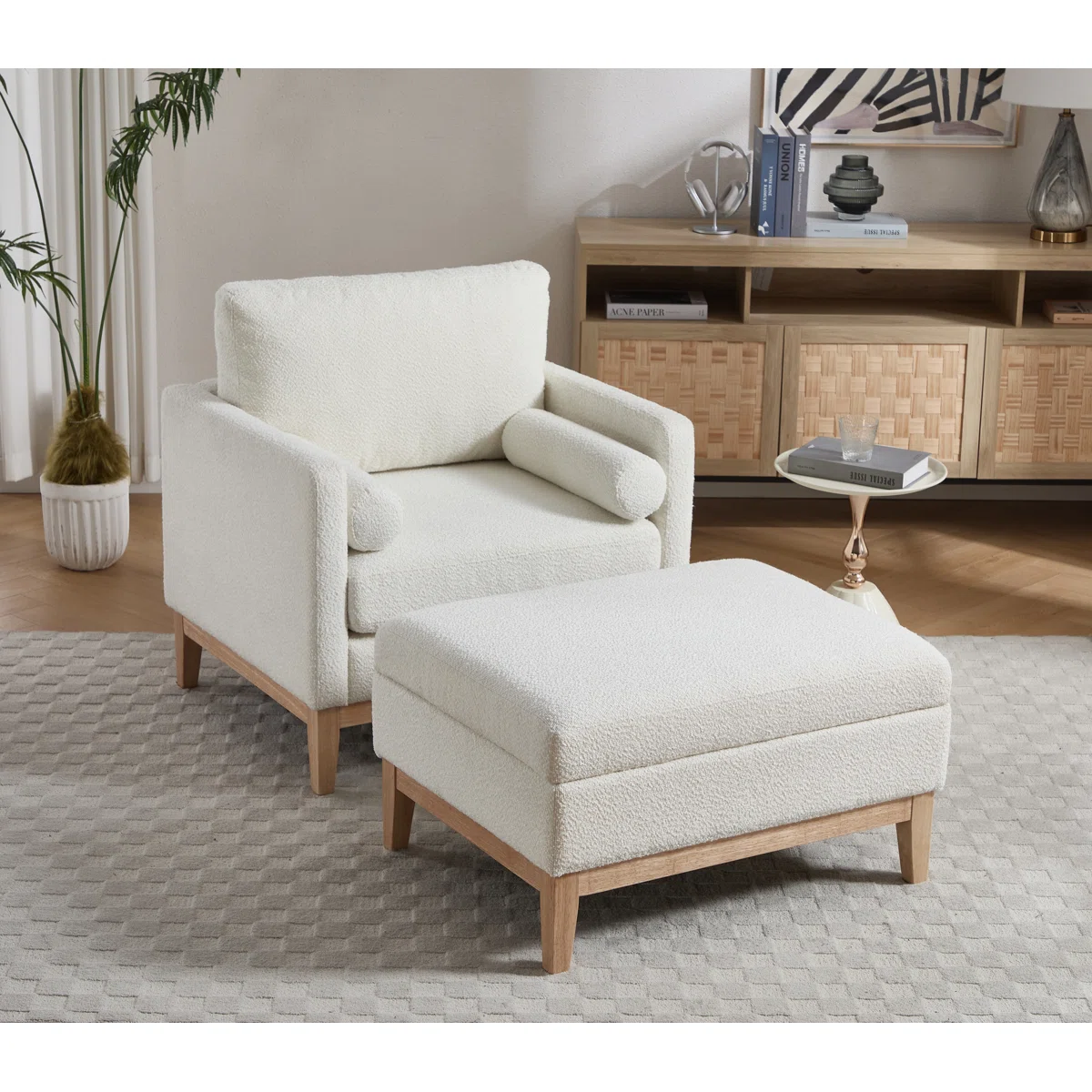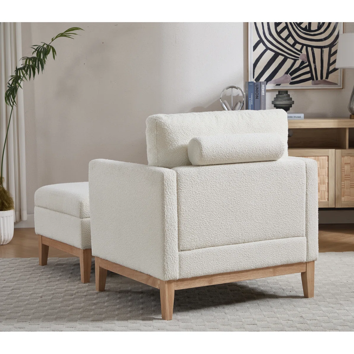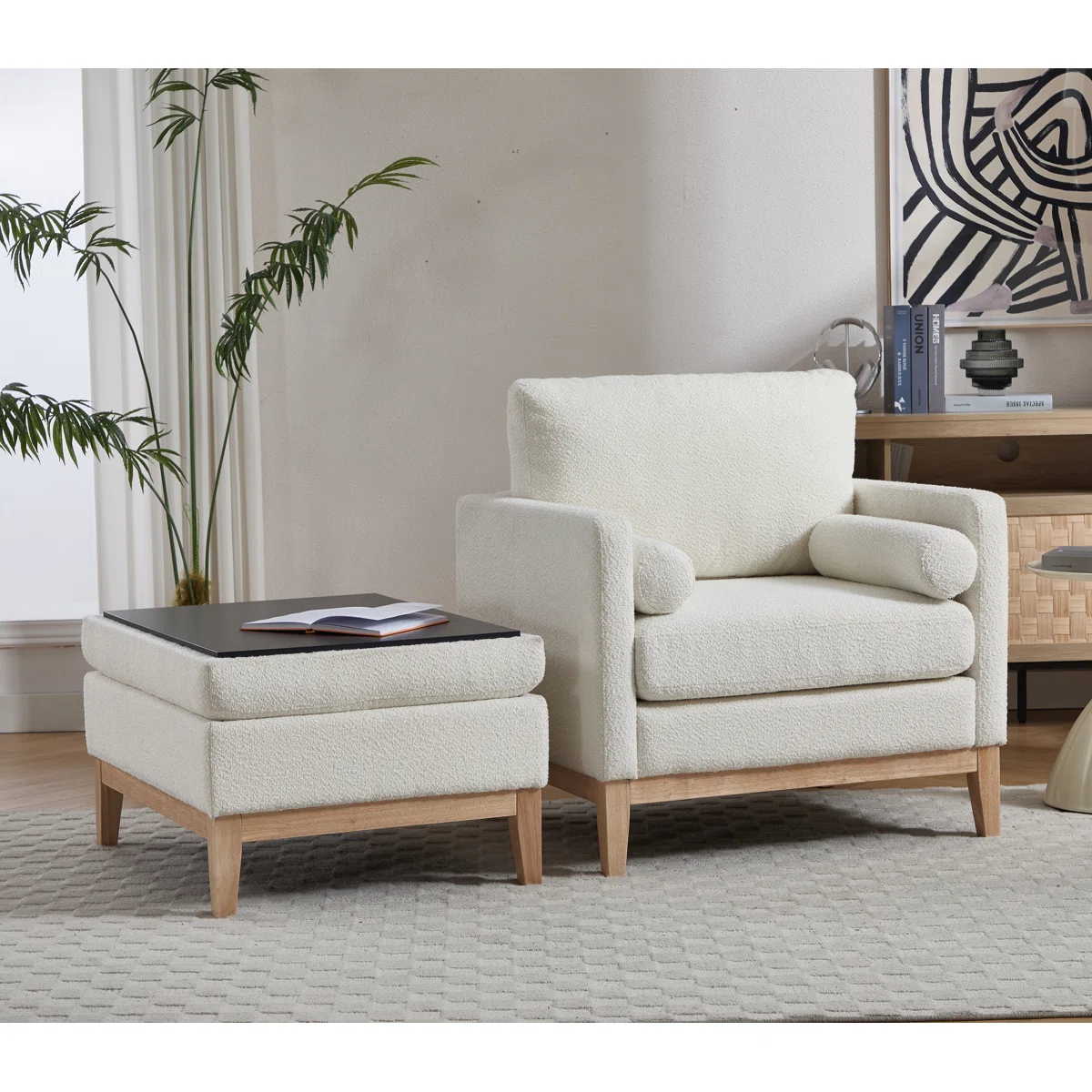 Elevate your lounging experience with this modern upholstered accent chair and ottoman set. The ottoman doubles as hidden storage and features a reversible lid that works as a cushioned footrest or a flat tabletop. When placed in front of the chair, it creates a chaise-style setup perfect for reading or relaxing. Plush cushions, bolster pillows, and durable wood construction make this set ideal for cozy corners, bedrooms, and modern living rooms.