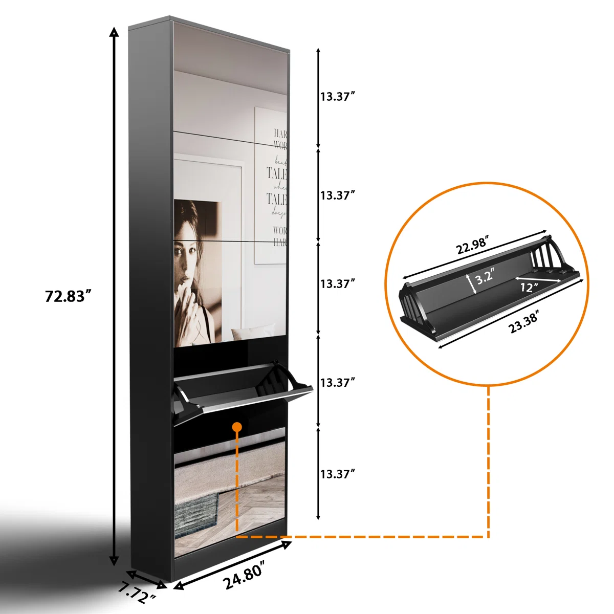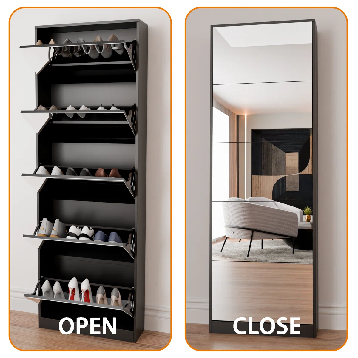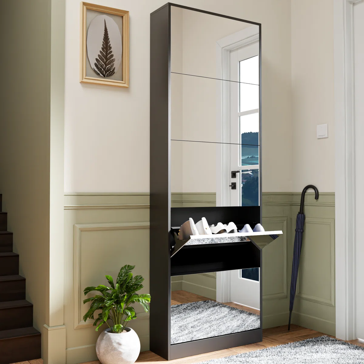 The Hokku Designs Modern Shoe Storage Cabinet combines style and practicality for narrow corridors and entryways. Featuring 5 hidden flip buckets, it keeps shoes neatly stored while preventing dust accumulation. The full-length high-definition mirror adds a functional and aesthetic element, perfect for a quick look before heading out. Crafted from high-quality manufactured wood with a slim but stable design, this freestanding cabinet efficiently utilizes small spaces while offering easy access and maintenance. Ideal for keeping your home organized without sacrificing style.