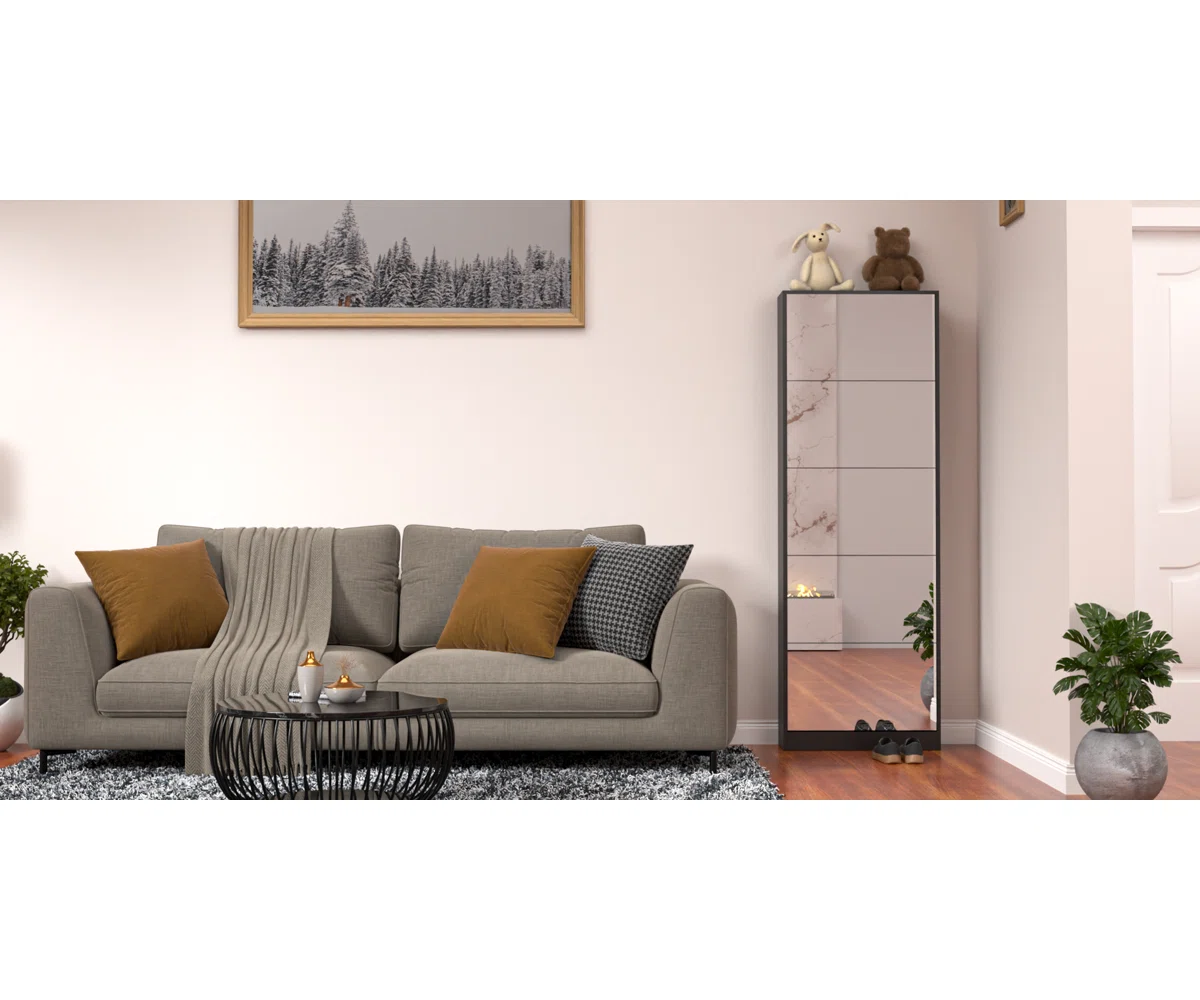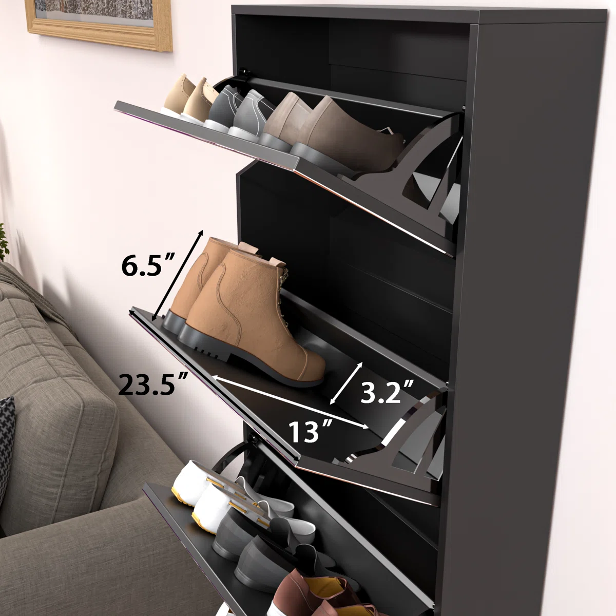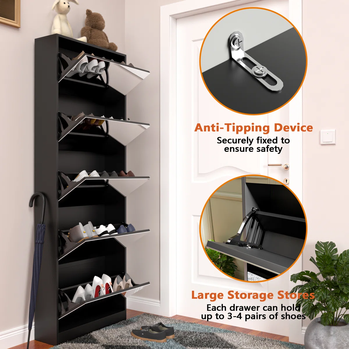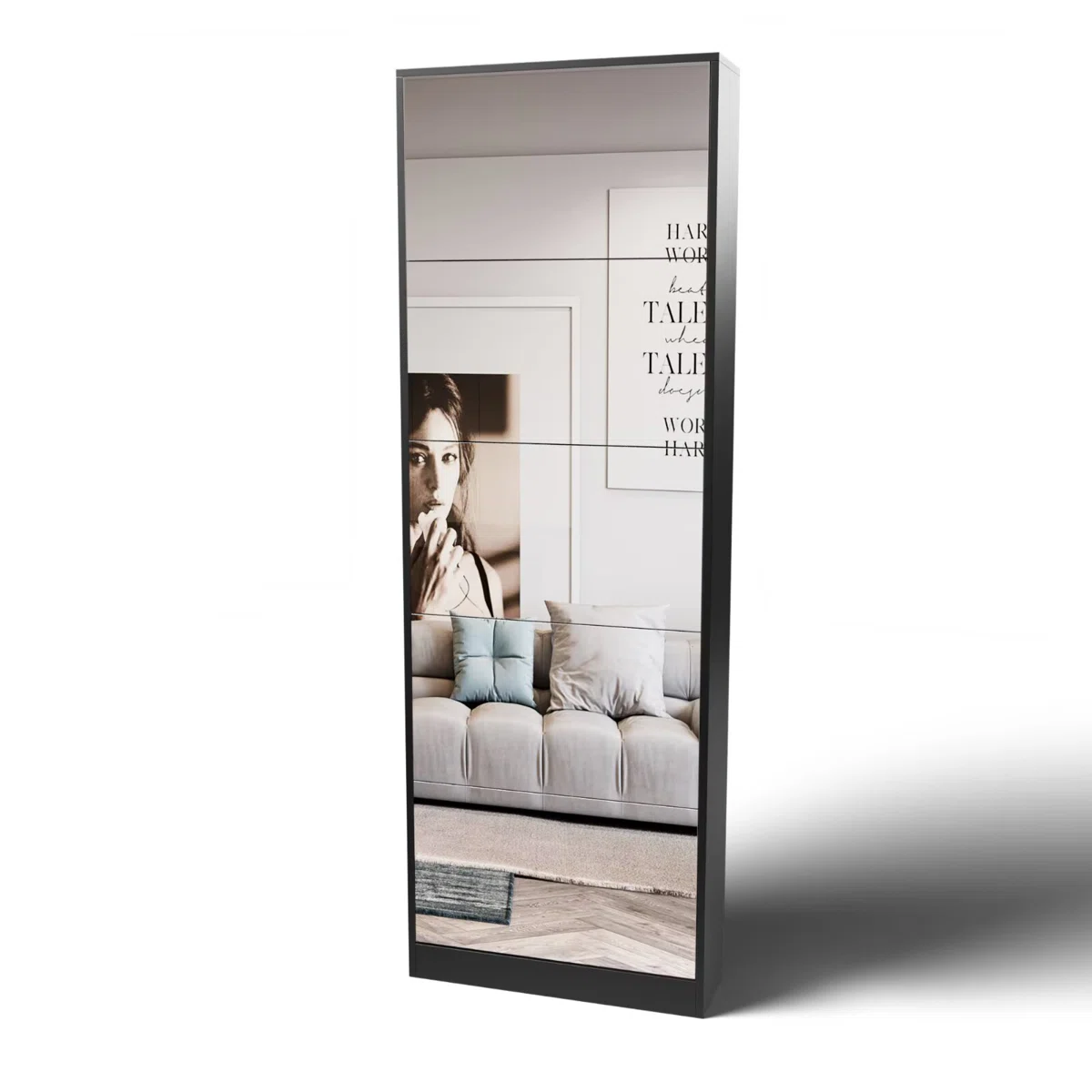The Hokku Designs Modern Shoe Storage Cabinet combines style and practicality for narrow corridors and entryways. Featuring 5 hidden flip buckets, it keeps shoes neatly stored while preventing dust accumulation. The full-length high-definition mirror adds a functional and aesthetic element, perfect for a quick look before heading out. Crafted from high-quality manufactured wood with a slim but stable design, this freestanding cabinet efficiently utilizes small spaces while offering easy access and maintenance. Ideal for keeping your home organized without sacrificing style.