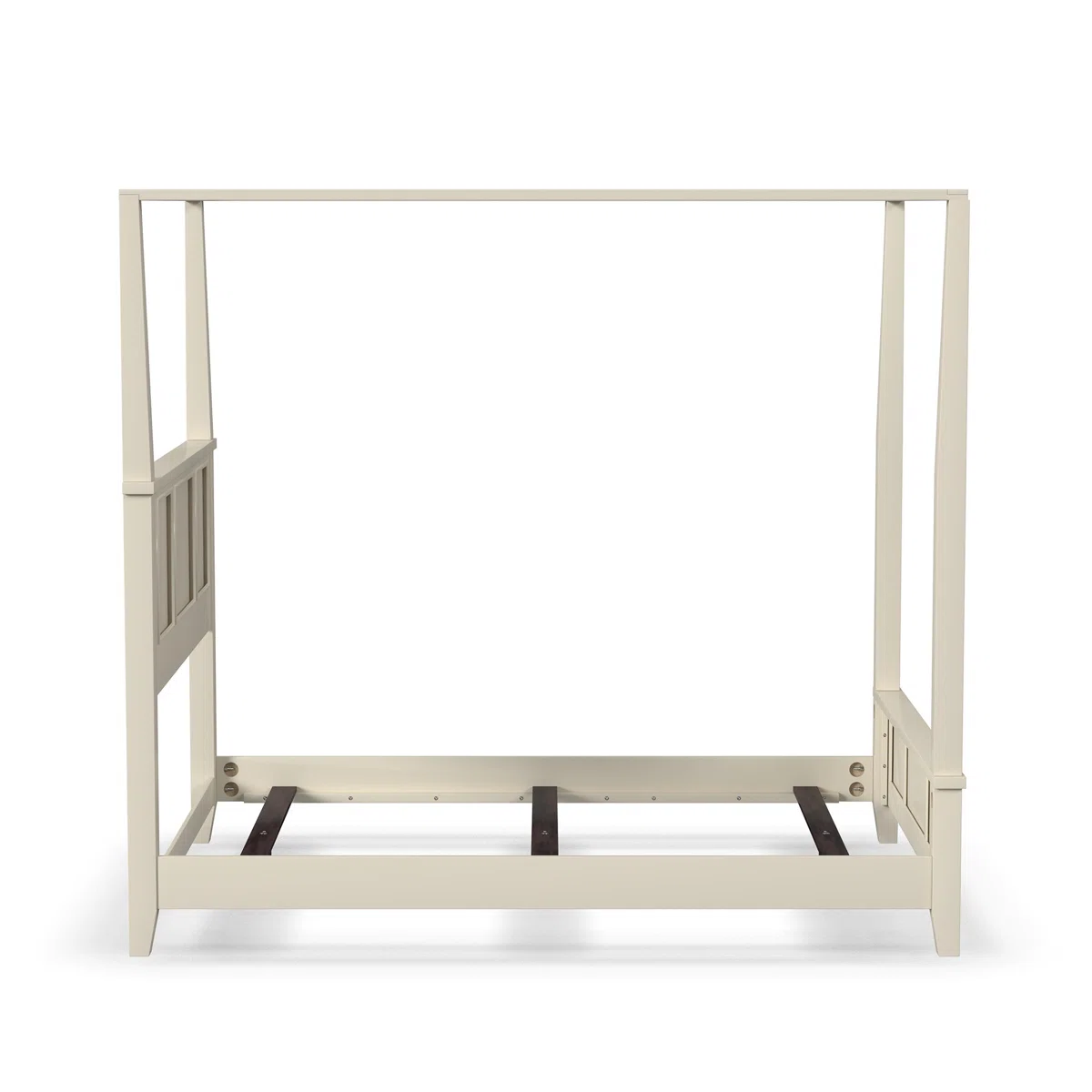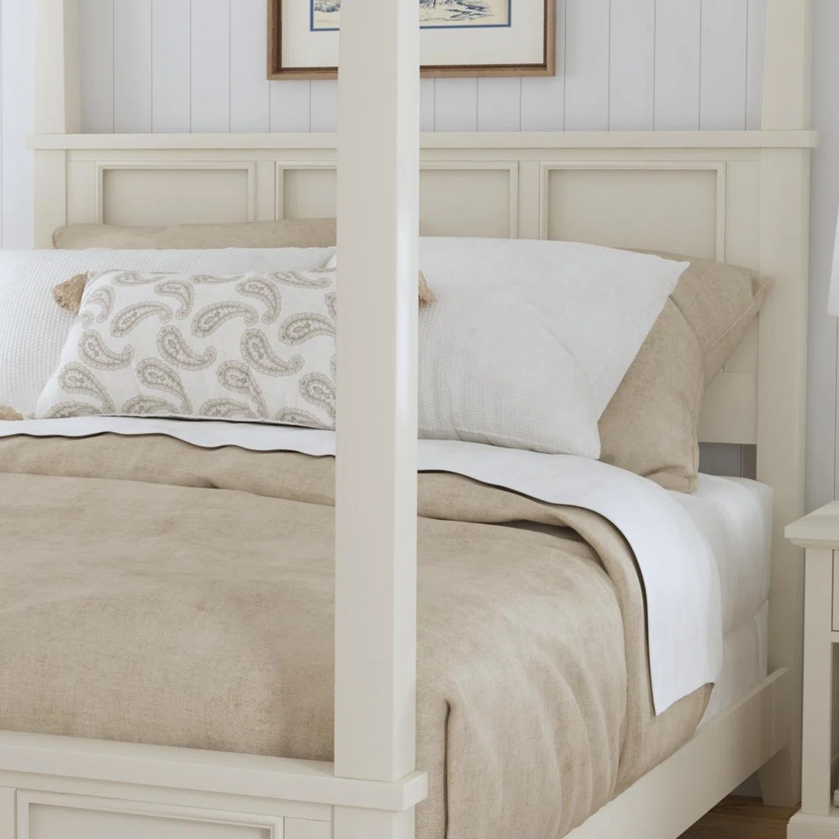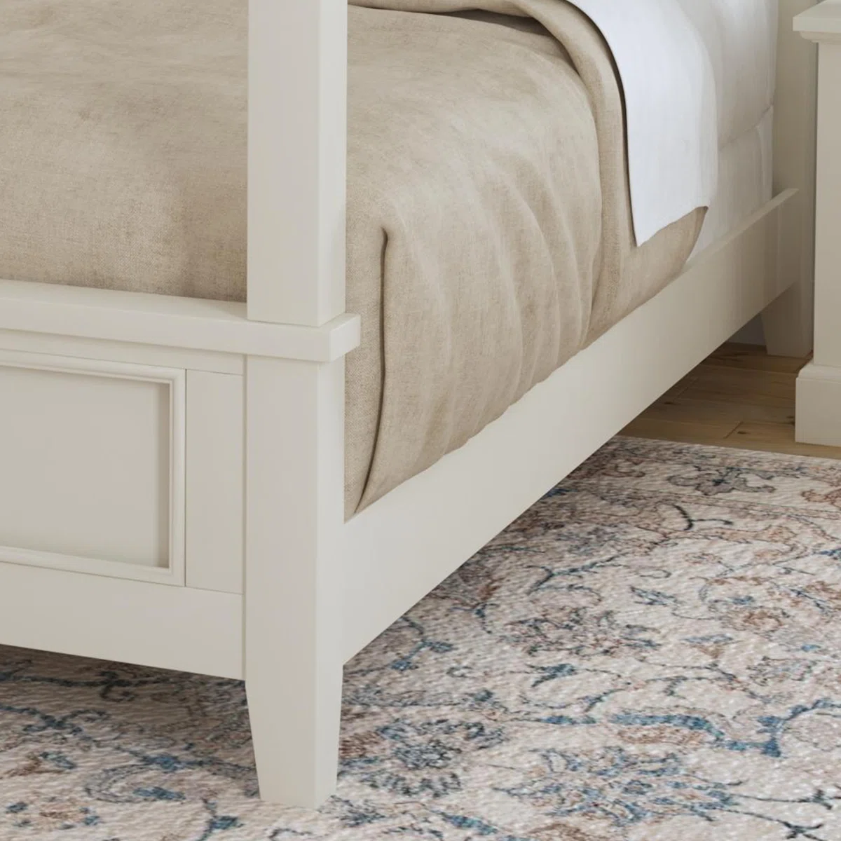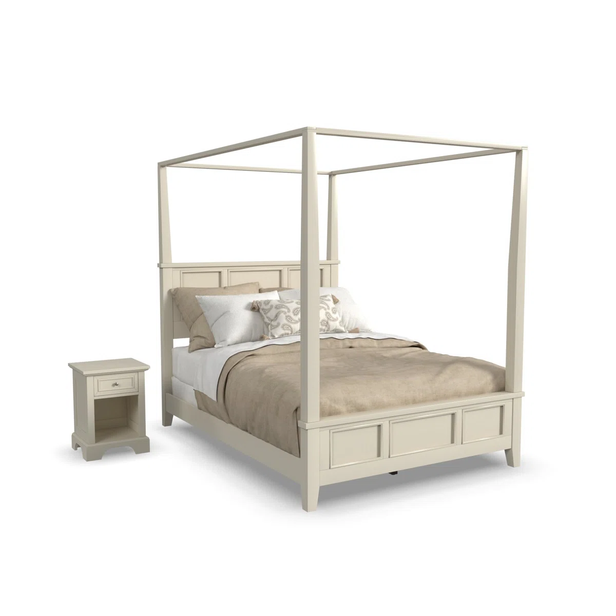 The Mosqueda Canopy 2-Piece Bedroom Set from Laurel Foundry Modern Farmhouse® brings timeless elegance and functionality to any bedroom. This queen-size panel canopy bed is crafted from solid and manufactured mahogany wood with an off-white finish. Classic raised panels, tapered legs, and a canopy frame allow for personalized fabric draping. The set includes a matching nightstand with a drawer and shelving, providing convenient bedside storage. Perfect for coastal or traditional bedroom styles, this set balances aesthetics, durability, and practicality.