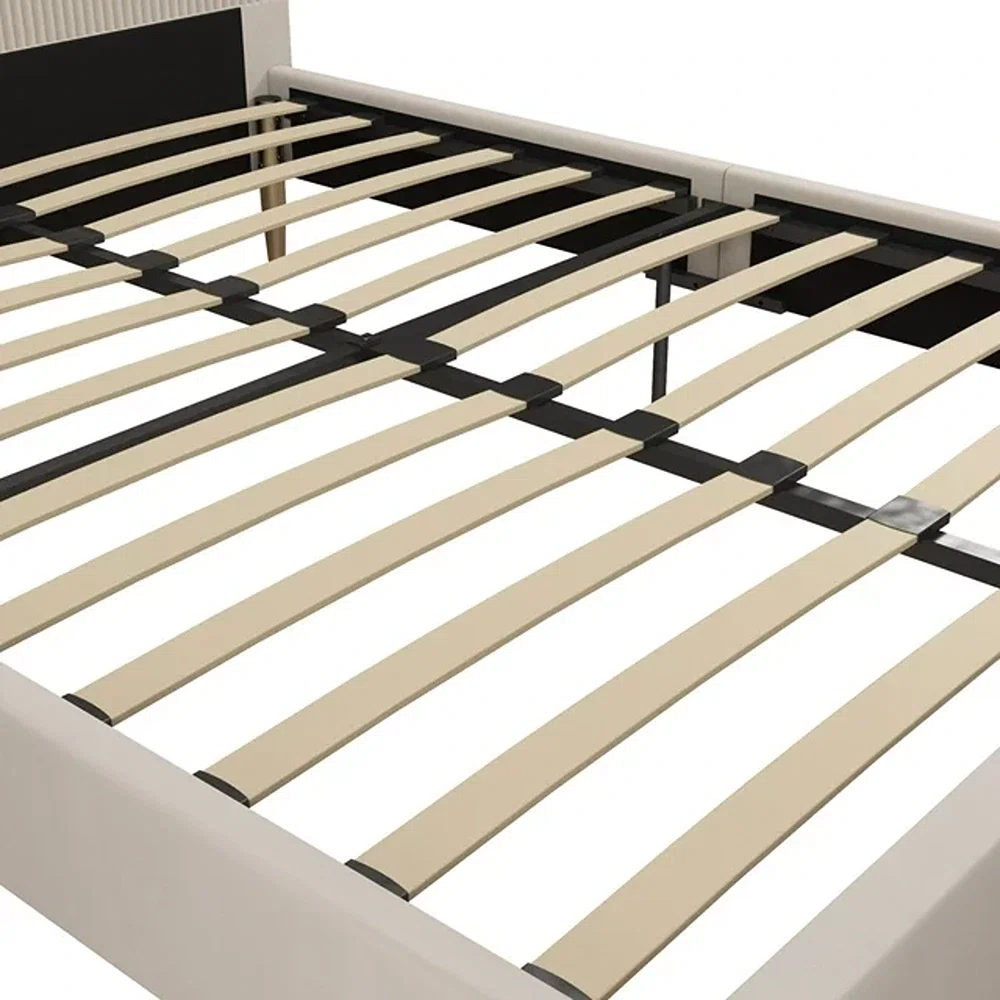 • Upholstered queen platform bed in soft ivory velvet