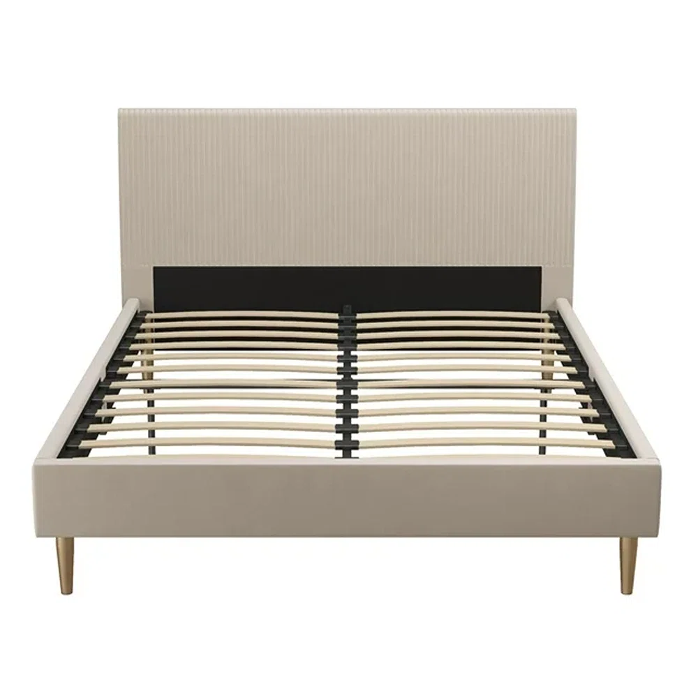 The Mr. Kate Daphne Upholstered Low Profile Platform Bed brings a perfect balance of vintage luxury and mid-century modern charm. With its soft-touch ivory velvet upholstery and tight vertical channel-tufted headboard, this bed makes an elegant design statement while maintaining a slim, space-saving profile. Brass-tone tapered metal legs add a hint of glam, and the sturdy wood frame features bentwood slats, metal side rails, and strong center support legs for durability and comfort. Designed without the need for a box spring, the Daphne is both stylish and practical—ideal for elevating any bedroom with a touch of modern-day glam. Easy assembly and a 1-year limited warranty are included.