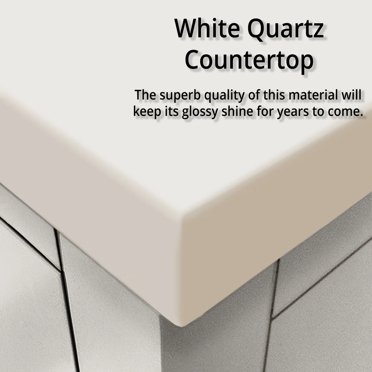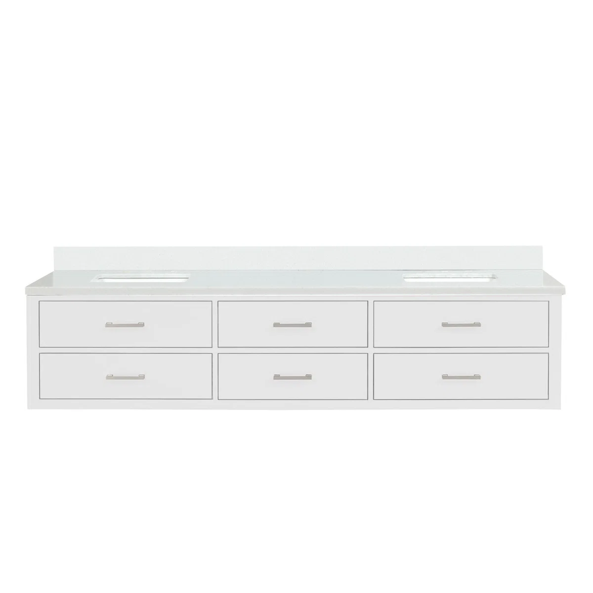 Upgrade your bathroom with the Pearl 84" Double Bathroom Vanity by Ebern Designs. This spacious vanity features a sleek white base paired with a durable quartz countertop and two ceramic sinks, providing both functionality and style for master or guest bathrooms. The built-in drawers and adjustable shelving behind doors offer organized storage for toiletries and bathroom essentials. Designed for both elegance and practicality, this vanity combines a clean modern aesthetic with long-lasting construction.