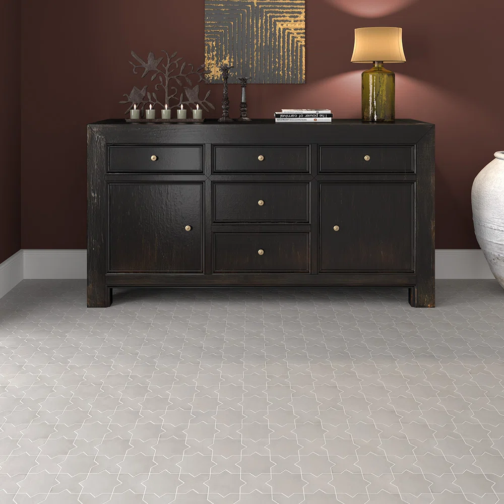 Transform your floors with the Star And Cross Porcelain Pattern Tile by Tilefy. Featuring a bold gray star and cross design with a Spanish/Moroccan matte finish these tiles bring charm and personality to bathrooms laundry rooms kitchens patios and more. Crafted from durable porcelain they are waterproof impervious and slip-resistant making them perfect for high-traffic and wet areas. Ideal for both residential and commercial applications this versatile tile makes it easy to create a fun timeless and stylish flooring or wall surface.