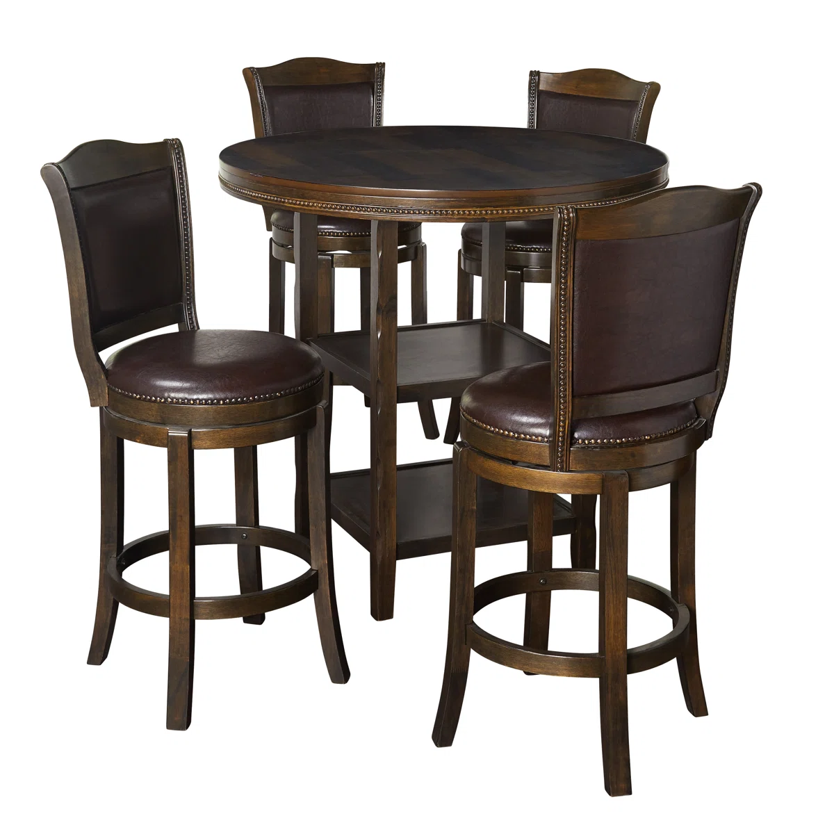 Includes one 42.5″ round dining table and four swivel chairs for a four‑person setup.