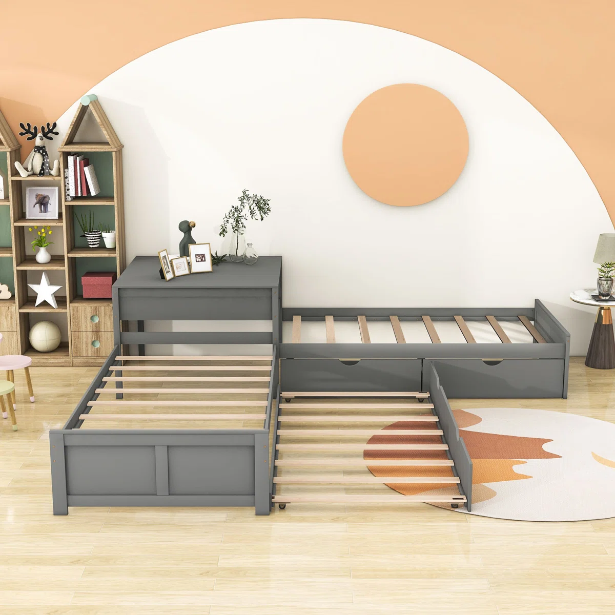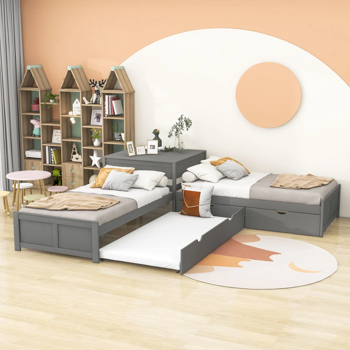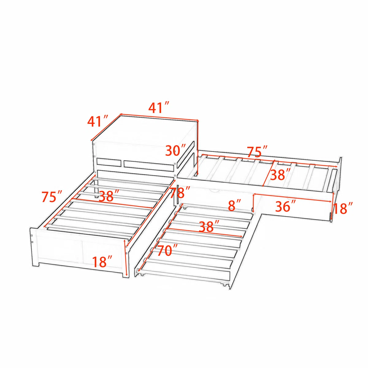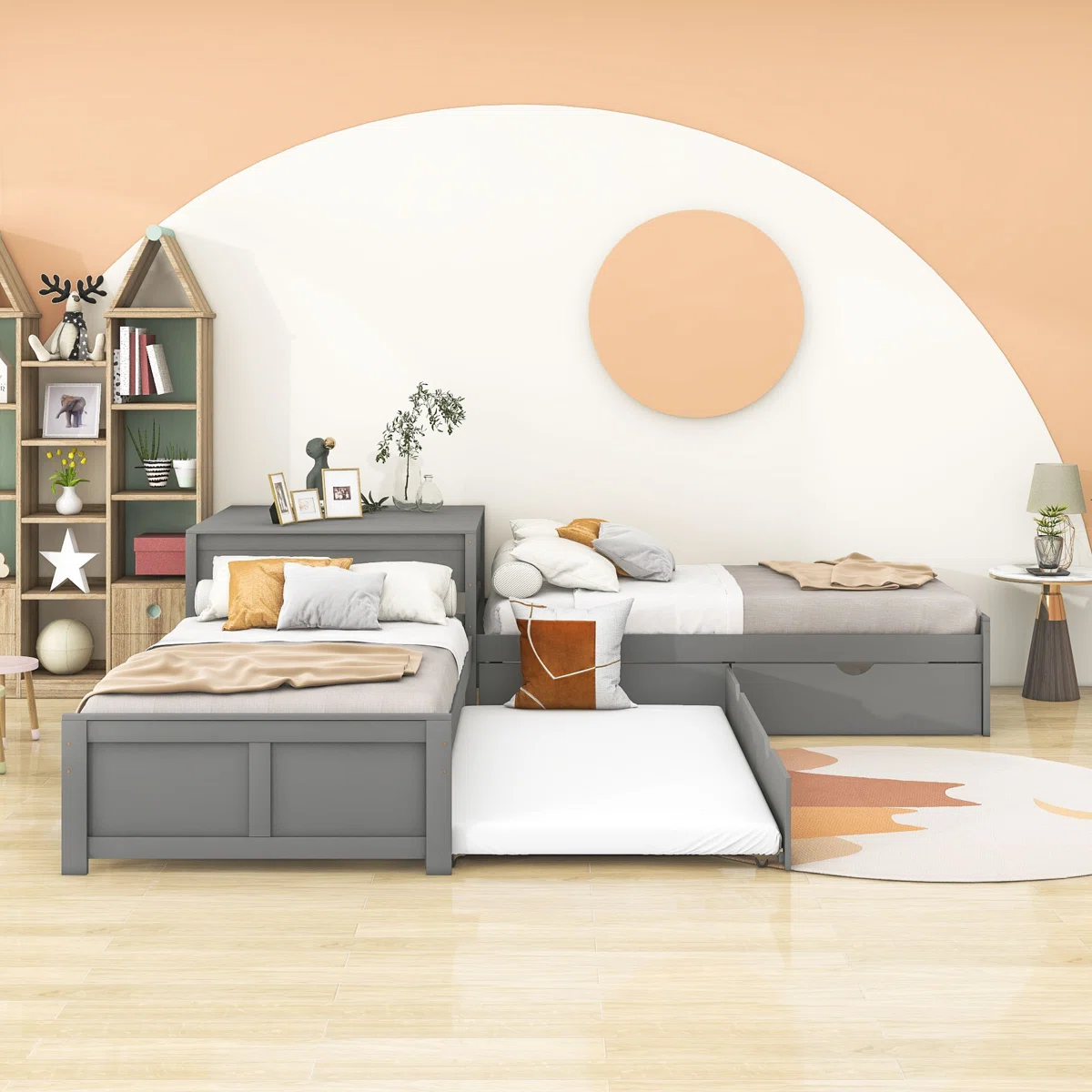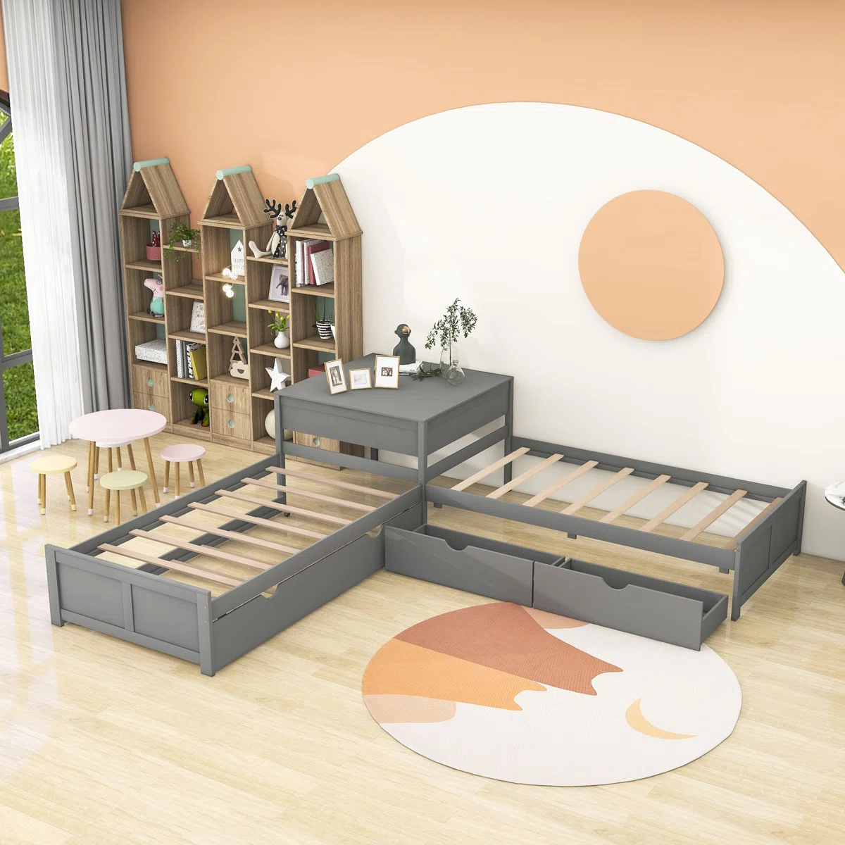 This Twin Size L-Shaped Wooden Platform Bed is a smart, space-saving solution designed for shared rooms, guest spaces, or compact bedrooms. Featuring two twin beds set in an L-shaped layout with a removable trundle, it offers three total sleeping spaces. Built from solid pine and MDF with sturdy wooden slats, it provides strong support without the need for box springs. A convenient built-in table between the beds functions as a nightstand, while two removable storage drawers help keep essentials neatly organized. Practical, durable, and versatile, this bed is an ideal choice for maximizing room function.