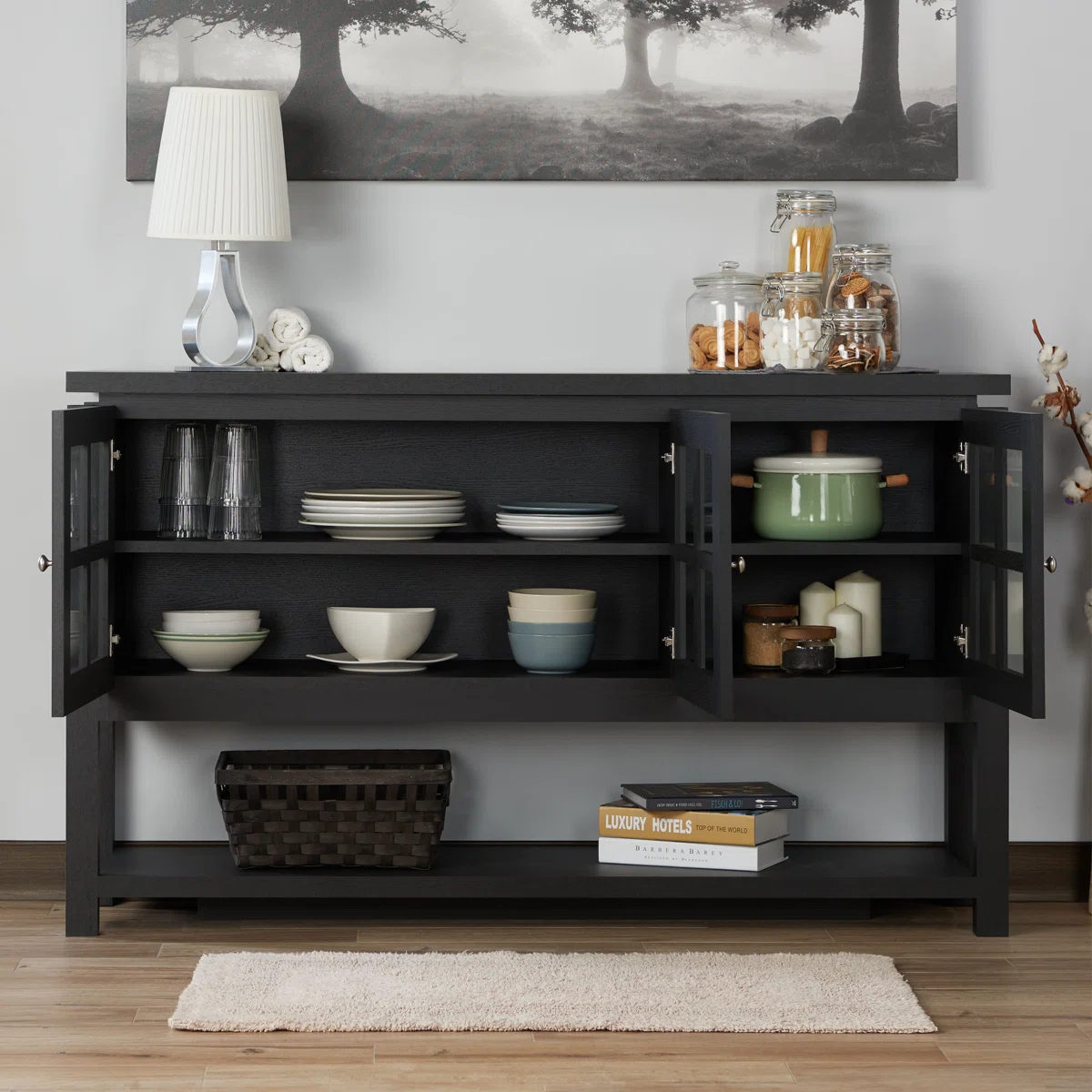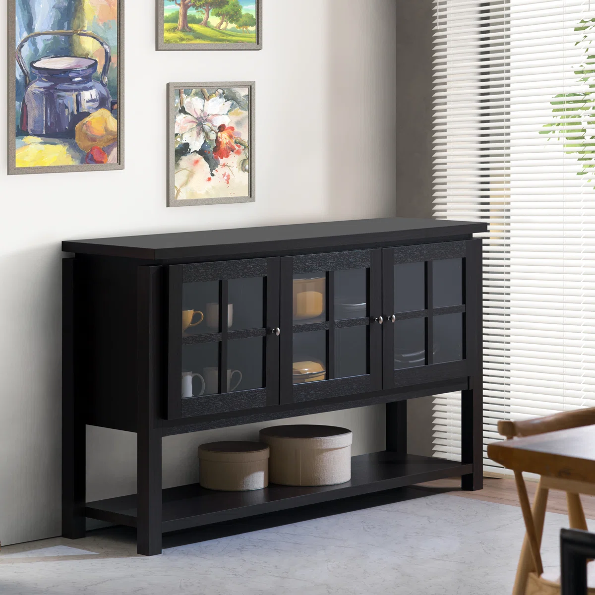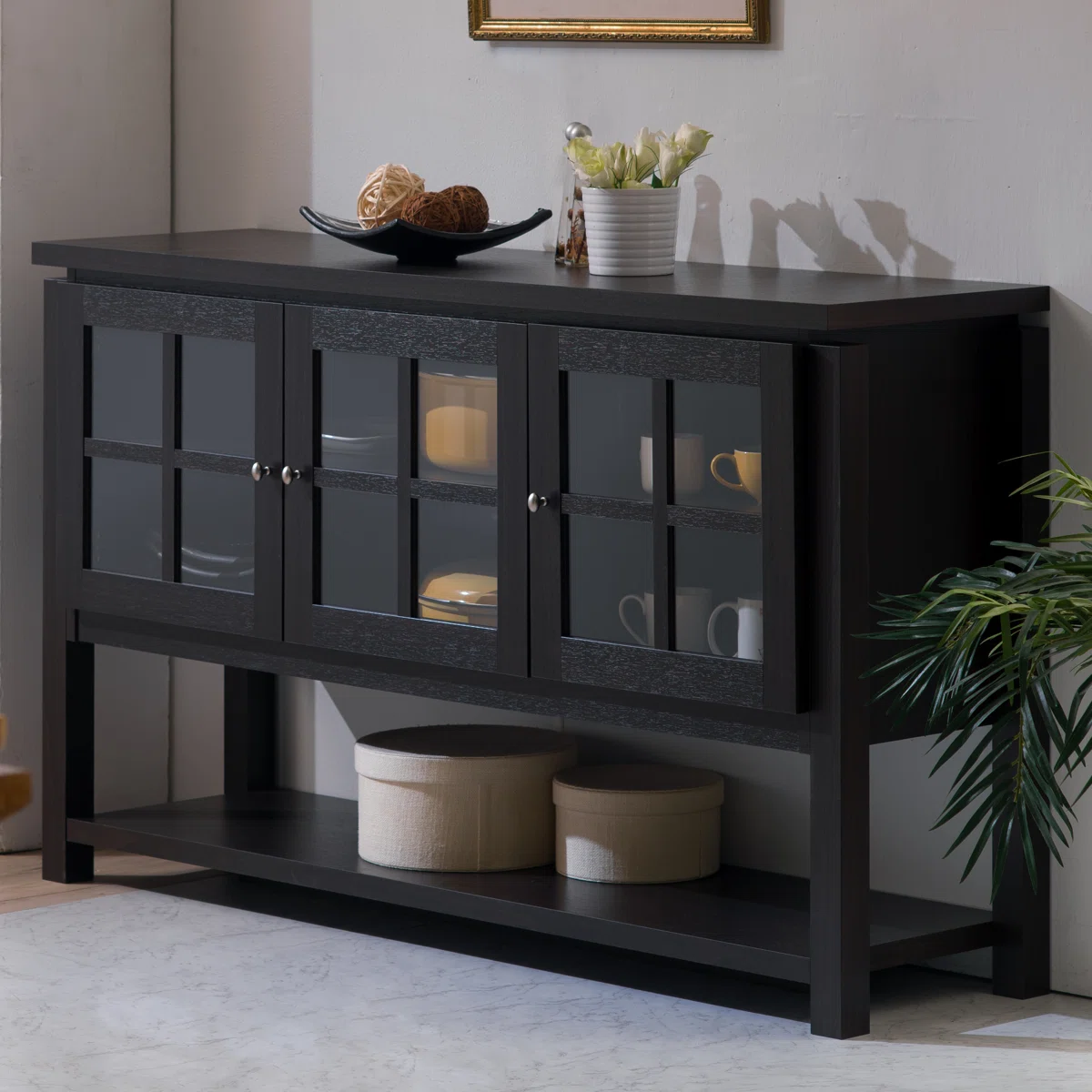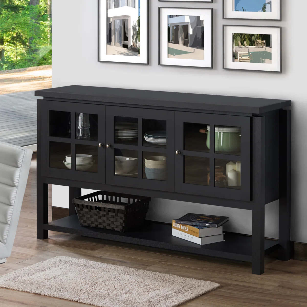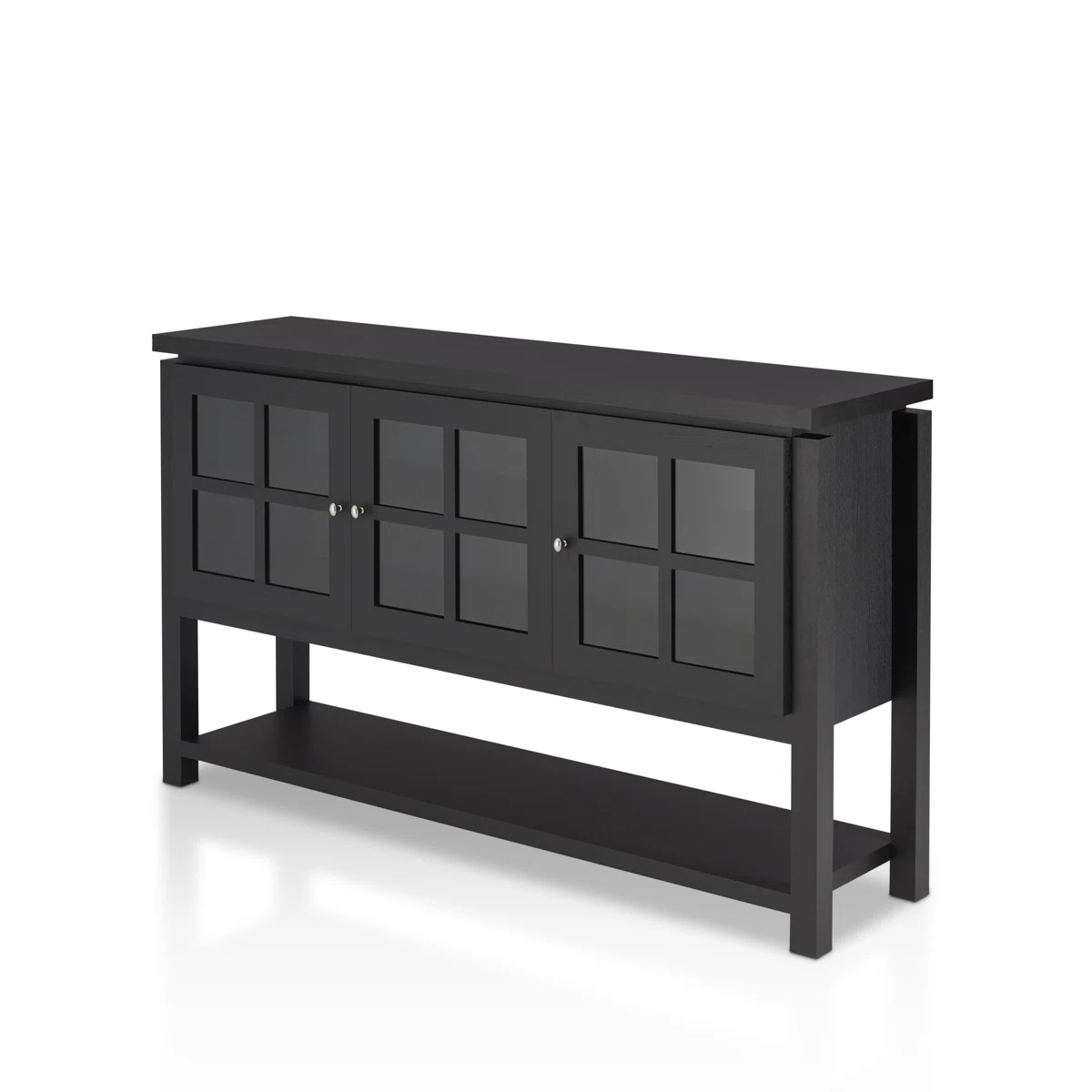 The Laurel Foundry Modern Farmhouse® Tyndalls Park 59" Wide Buffet Table brings style and functionality to any dining room or living room. Featuring a kiln-dried engineered wood frame, this server includes three glass-front windowpane doors that beautifully display dinnerware or décor. A spacious lower shelf provides open storage for additional items, while the wide top is ideal for coffee setups, décor, or even supporting a TV. With clean lines, round metal pulls, and a sturdy construction, this buffet table blends modern farmhouse charm with practical everyday use.