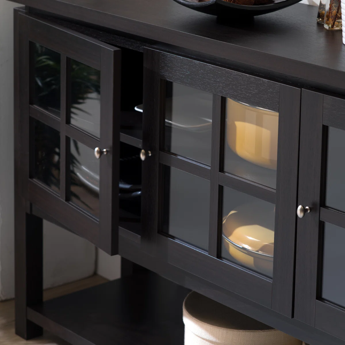 • Glass windowpane doors allow stylish display of dishes, décor, or essentials