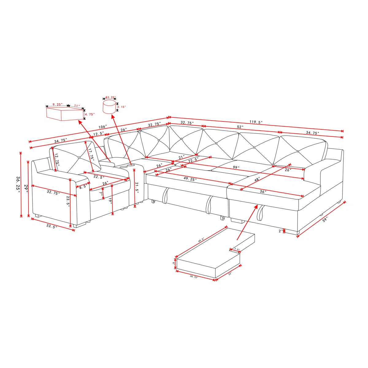 Designed for families and multifunctional use, it includes a hidden pull-out bed that extends to a generous 99" x 48" sleeping area, a deep storage chaise, and additional armrest storage compartments. The center backrest folds down to reveal a convenient table with cup holders, USB charging ports, and AC power outlets—ideal for powering devices during movie nights or gatherings.