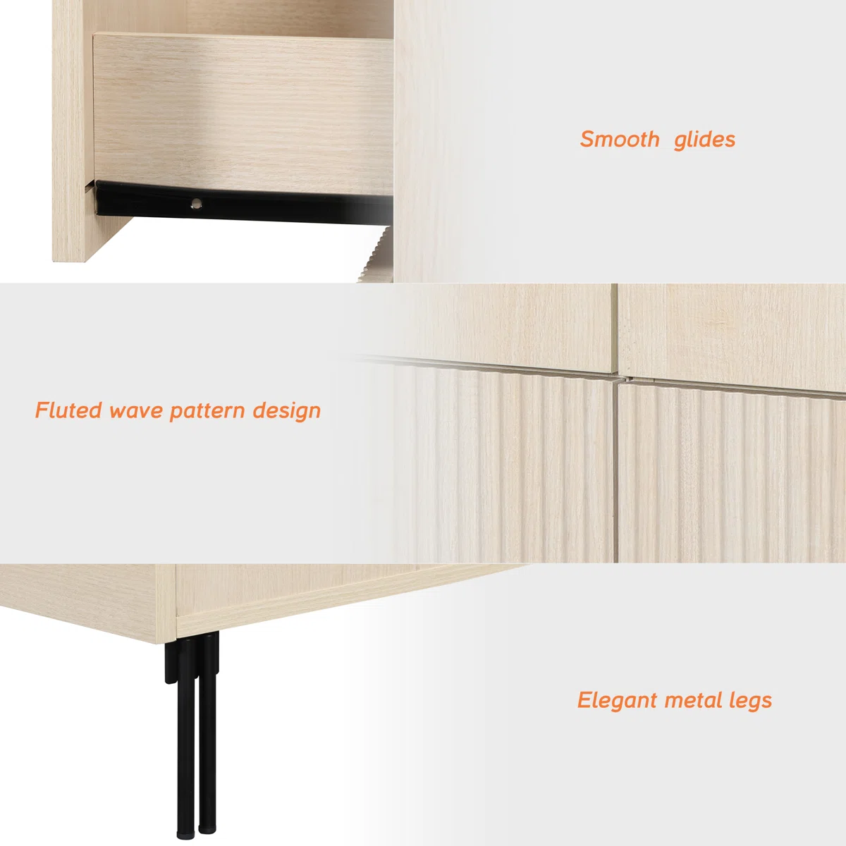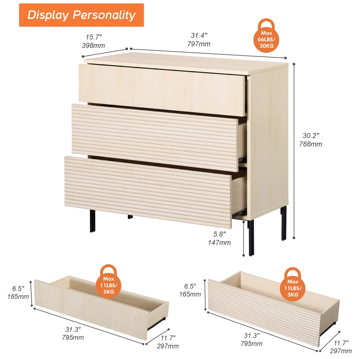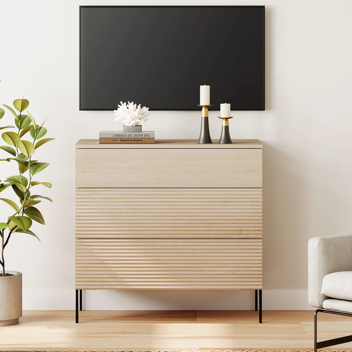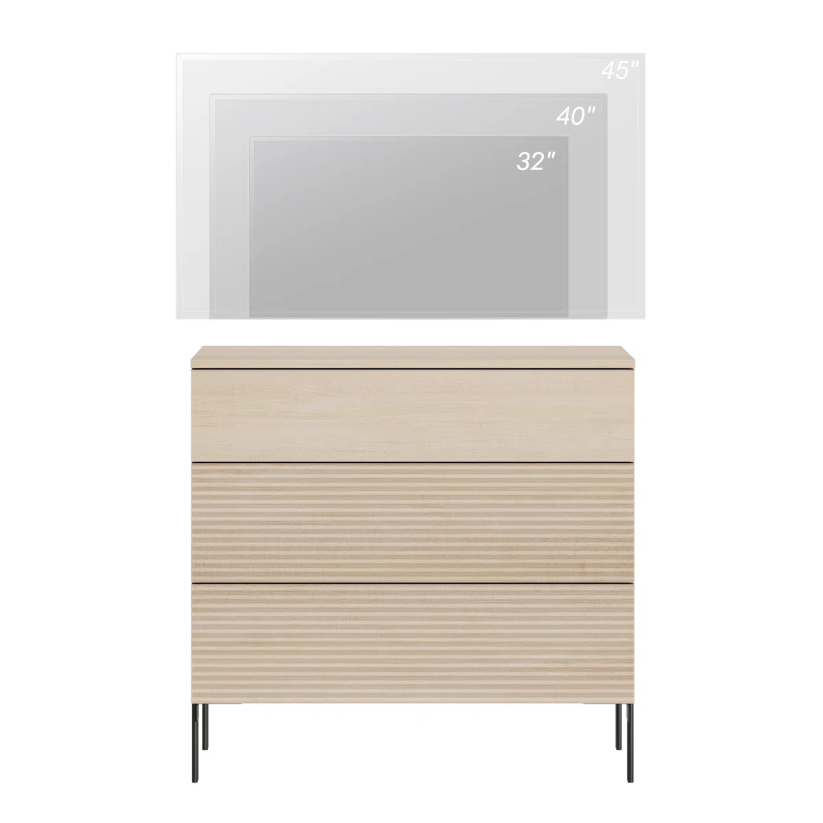 Upgrade your living space with the Union Rustic Modern 3-Drawer Dresser TV Stand, a stylish blend of contemporary elegance and practical storage. Designed with a sleek reeded front, smooth push-to-open drawers, and slender metal legs, this entertainment center brings modern sophistication to any living room, bedroom, or media area.