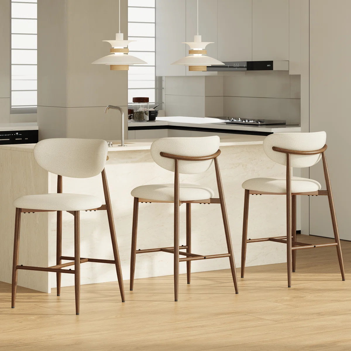 • Set of 3 counter stools with beige upholstered seats