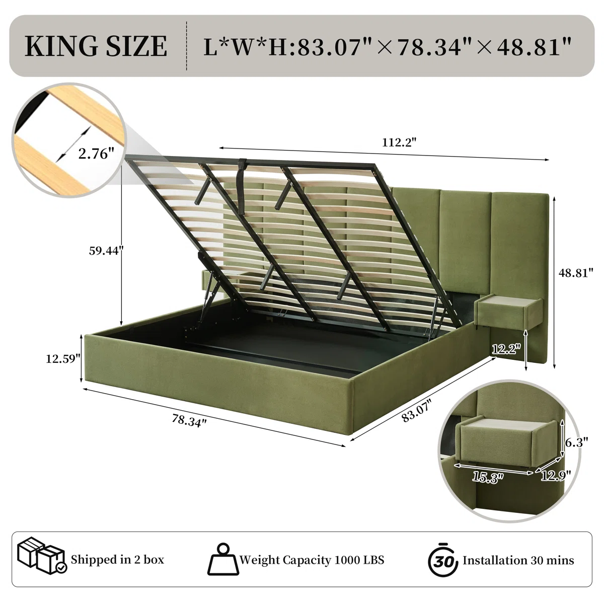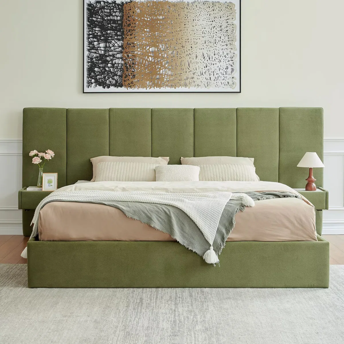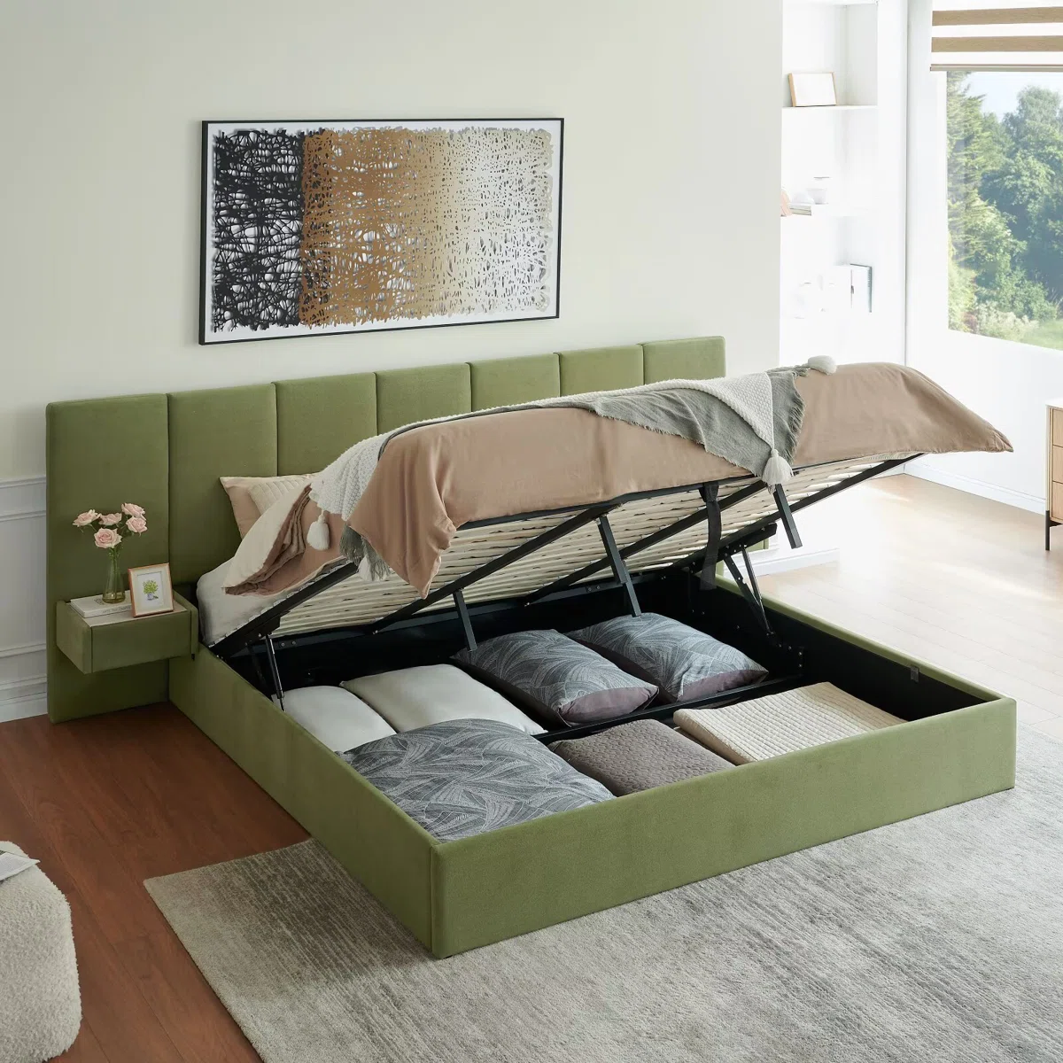 Upgrade your master bedroom with the Latitude Run Upholstered Lift Storage Bed Frame featuring a hotel-style wide headboard, plush green velvet upholstery and a space-saving gas-lift storage base. Designed for king size mattresses, it offers sprung slats for enhanced mattress support and eliminates the need for a box spring. With full-width drawers beneath the bed and a luxurious silhouette, this frame blends functionality and contemporary elegance.