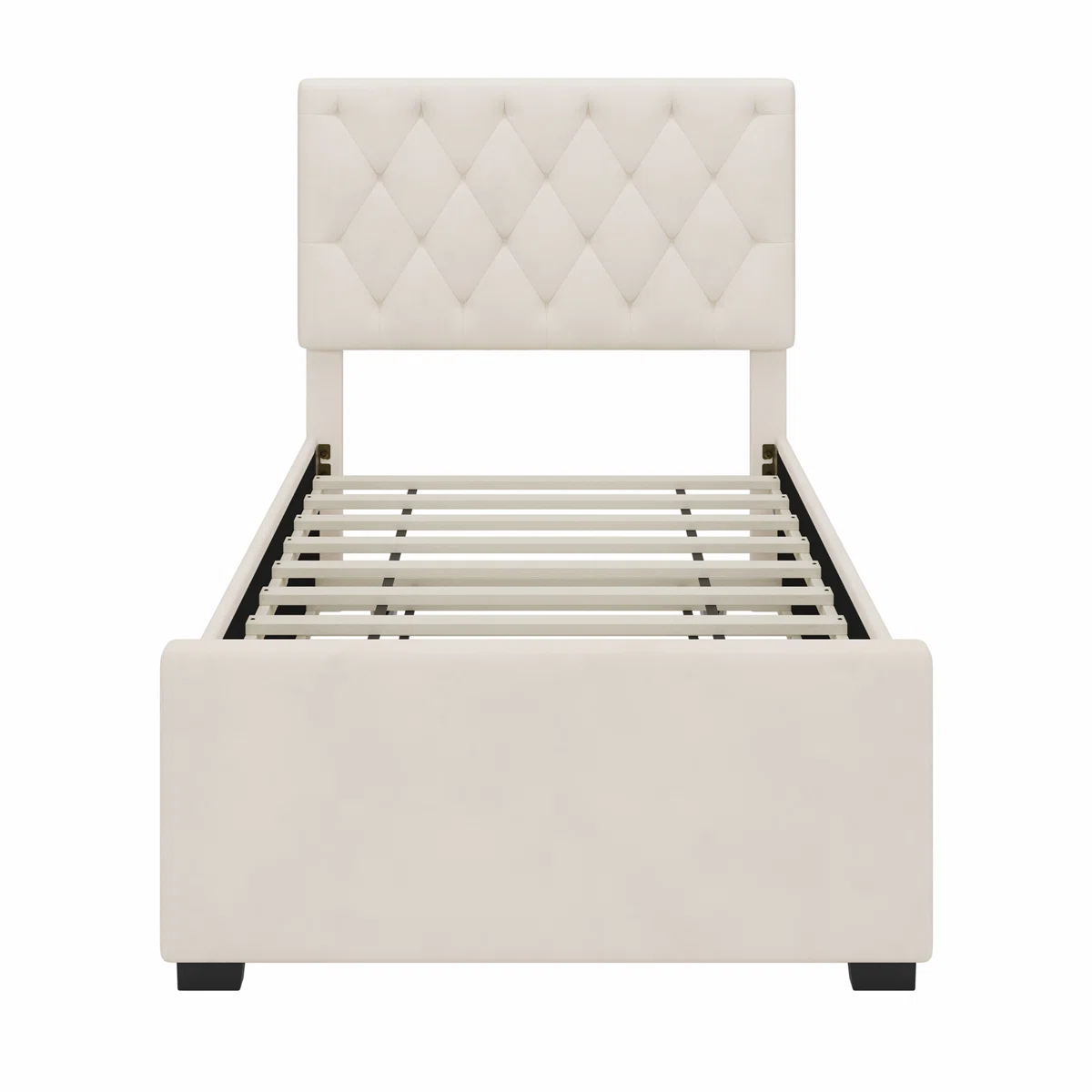 • Twin-size platform bed upholstered in soft beige velvet with button-tufted headboard