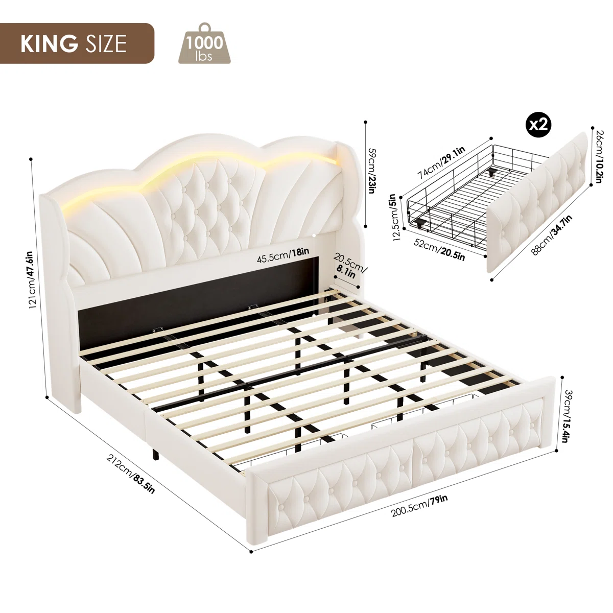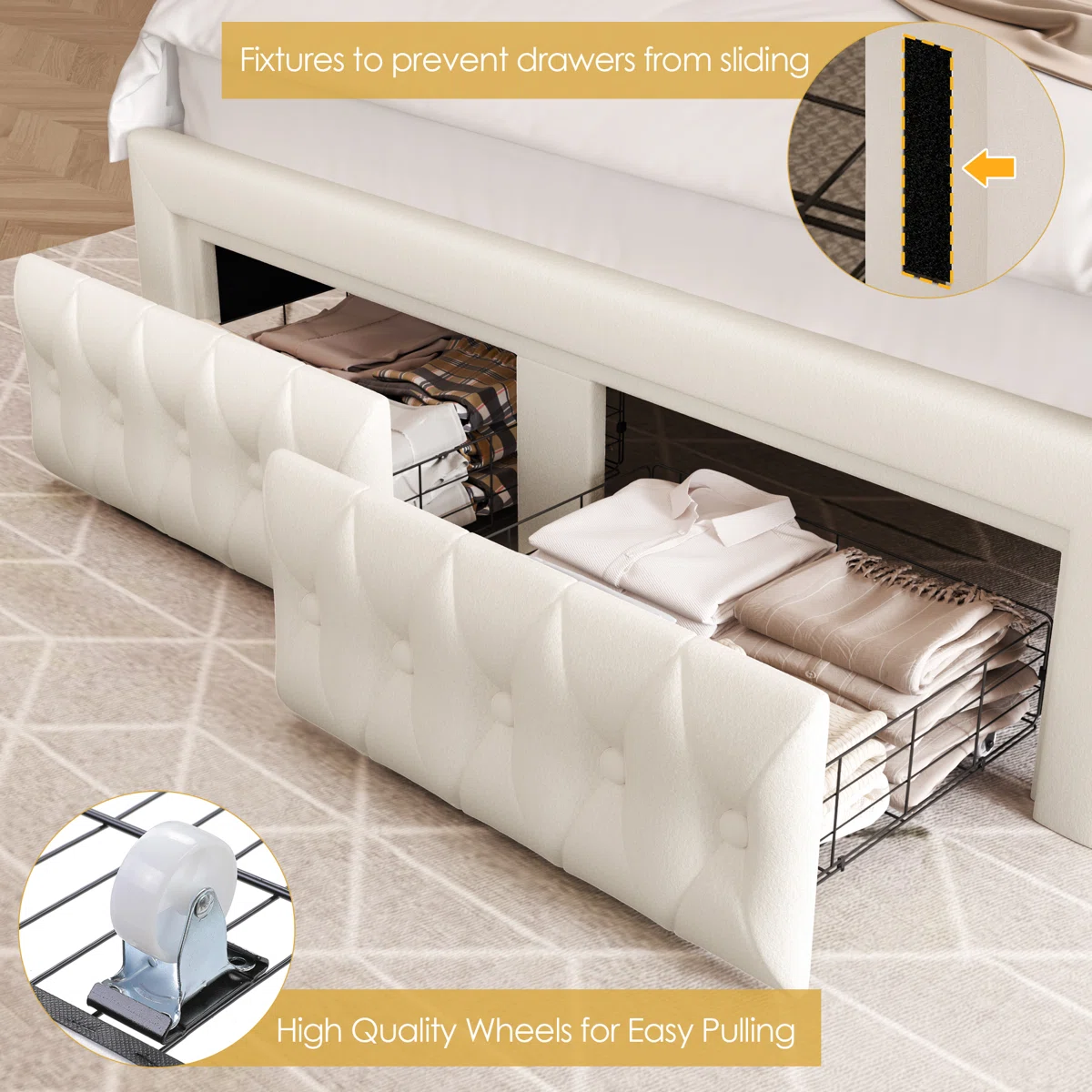Storage Drawers: Spacious under-bed sliding drawers for sheets, clothing, and essentials