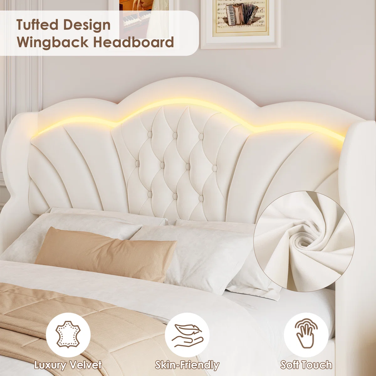 Wingback Headboard: Soft velvet upholstery with tufted design for comfort and support