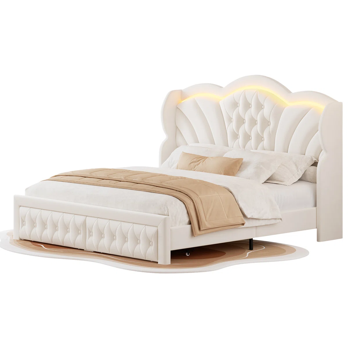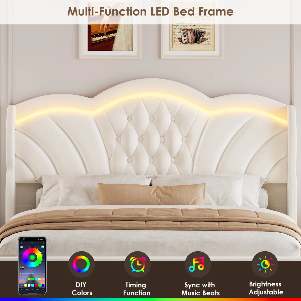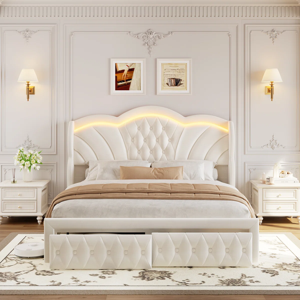 Elevate your bedroom with the Velvet Upholstered Wingback Storage Bed with LED Lights, combining luxurious comfort and practical functionality. The tufted wingback headboard is upholstered in soft velvet, offering a cozy, enveloping feel while providing neck and back support. Integrated LED lights, controllable via smartphone app, allow you to set the perfect mood or sync the lights with music, creating a personalized and relaxing ambiance.