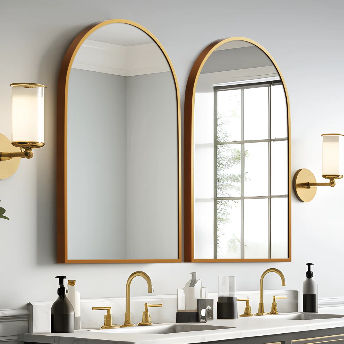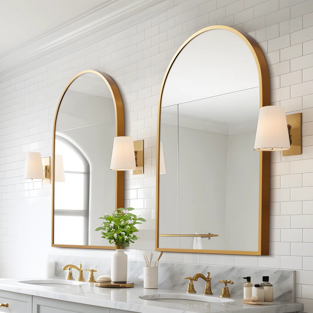 The Vercher Arched Metal Bathroom & Vanity Mirrors (Set of 2) bring elegant symmetry and modern charm to any bathroom, vanity, or entryway space. Designed with gracefully arched tops, these mirrors visually elevate the room by drawing the eye upward, creating a sense of height and openness. Each mirror features a slim, minimalist aluminum frame surrounding shatterproof glass, offering both style and durability. Their versatile size makes them ideal for double vanities, while the sleek silhouette pairs effortlessly with a wide range of décor styles. These mirrors can be wall-mounted using the included hardware or leaned on a vanity surface for a more relaxed, contemporary look.