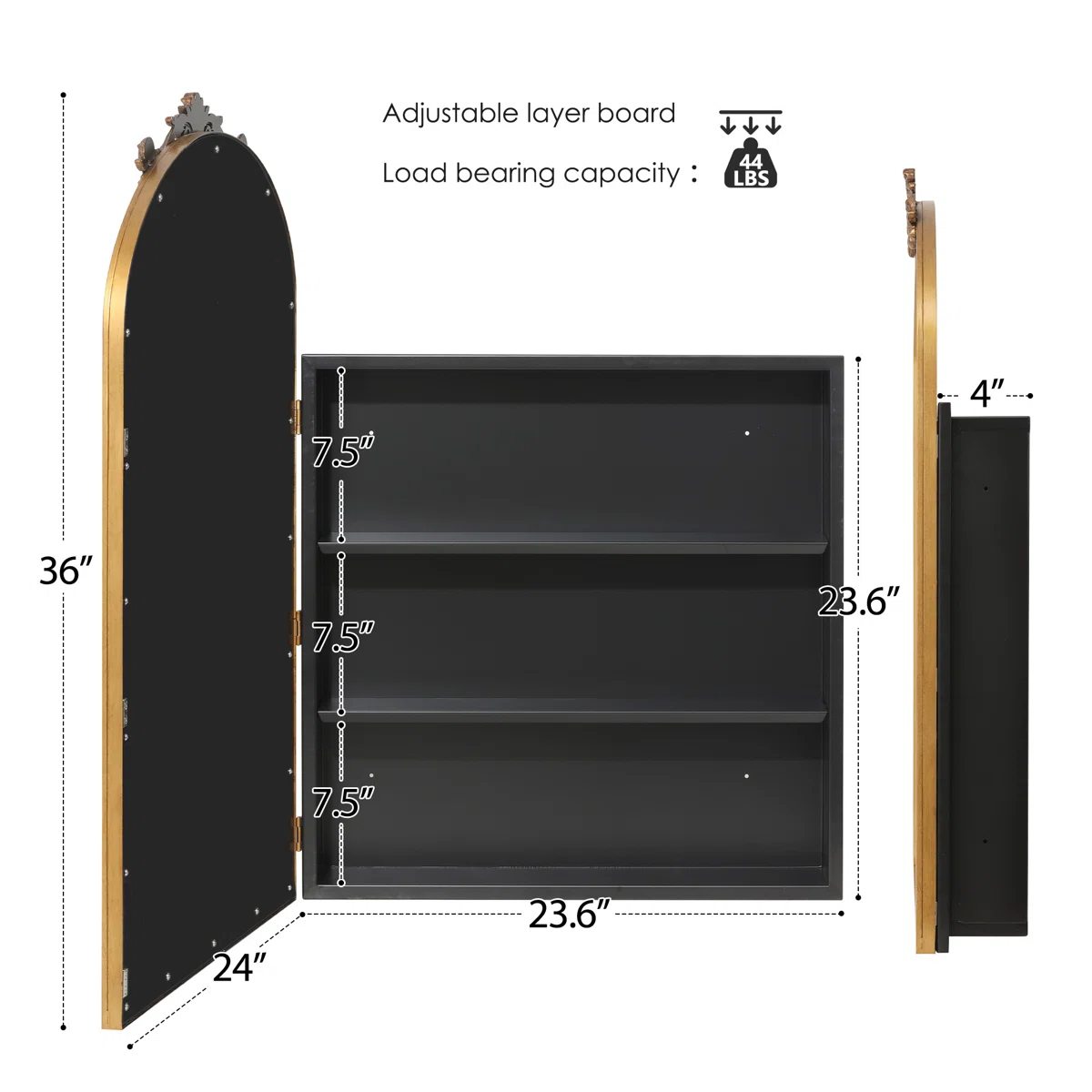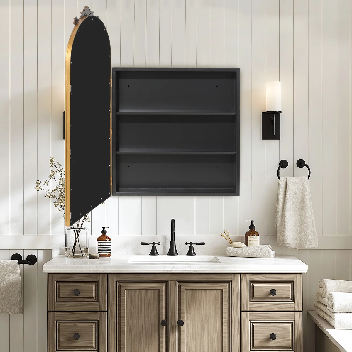 Bring a brilliant and decadent accent to your bathroom decor. This medicine cabinet with mirror features a baroque-inspired design, with an intricate overlay on its metal frame. The antique finish and the ample storage space bring it together as a transitional decorative piece to display above your sinks in your bathroom.