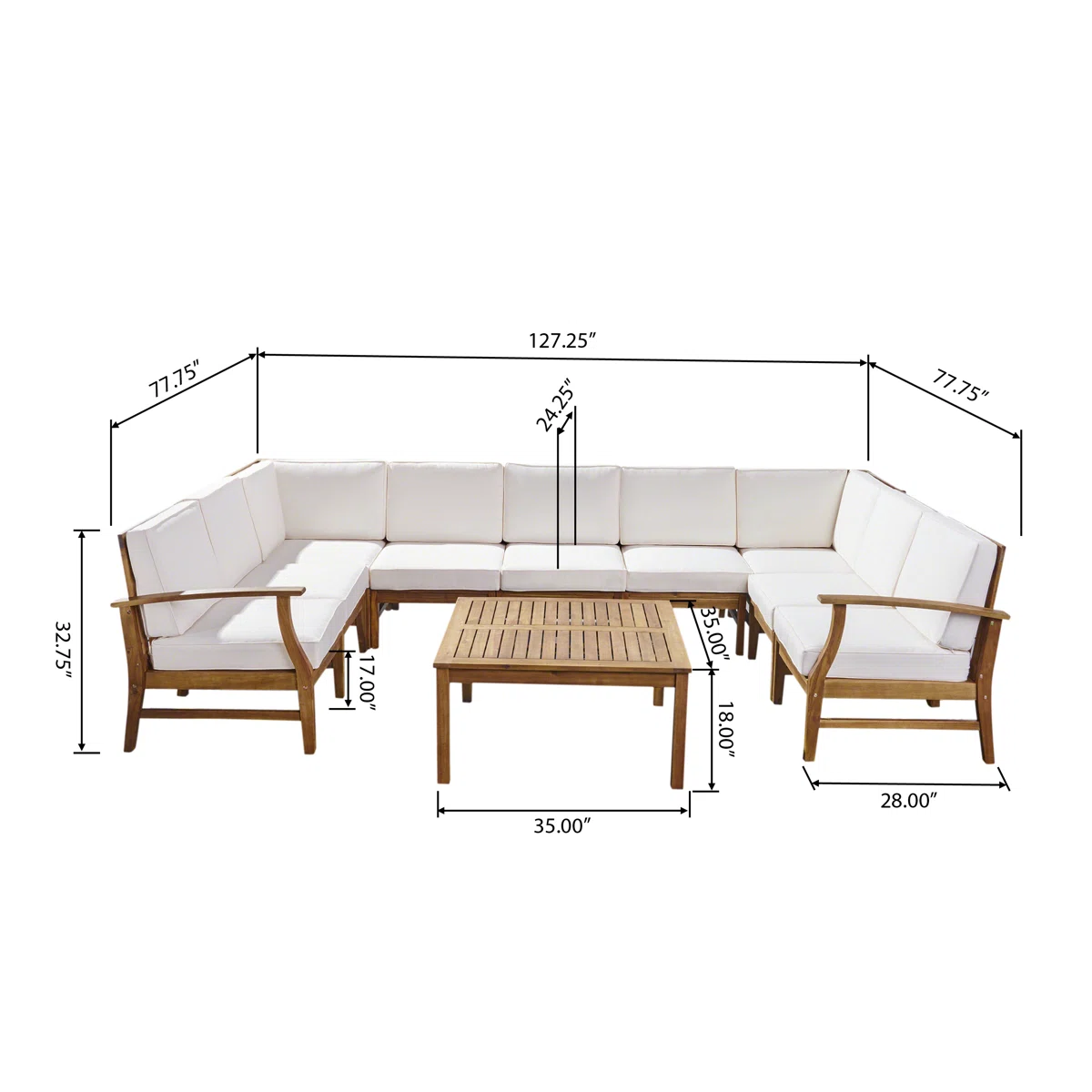 • 9-piece modular outdoor sectional seating group including sectional, armchair, cushions, and a solid acacia wood coffee table