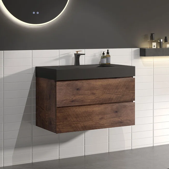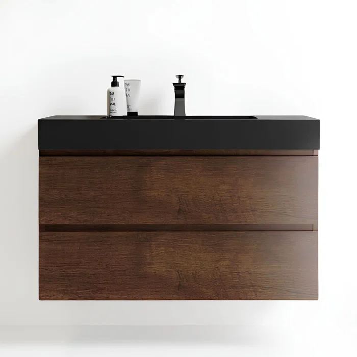The Ebern Designs Wall-Mounted Single Bathroom Vanity with Quartz Top delivers a sleek, modern aesthetic while maximizing functionality in compact or contemporary spaces. Its floating design enhances visual spaciousness, while the matte black integrated rectangular sink pairs beautifully with the warm walnut base for a stylish contrast. Built from durable solid + manufactured wood with eco-friendly E1-grade boards, the vanity ensures long-lasting performance with water-resistant and stain-resistant surfaces. Soft-close drawers, including a smart U-shaped top drawer, offer enhanced organization without interfering with plumbing. Designed for strong wall-mount installation, this vanity brings refined craftsmanship, practicality, and minimalistic sophistication to any bathroom upgrade.