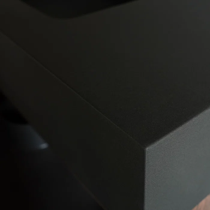 Sleek walnut base with handle-free 45° angled drawer fronts