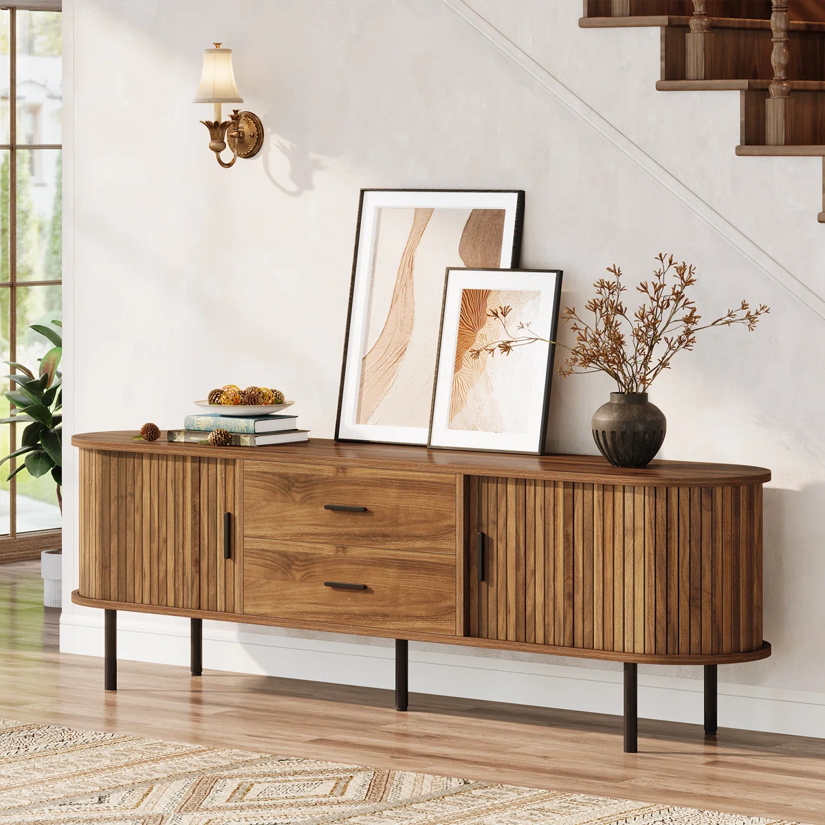 The Latitude Run® 70" Mid-Century Modern Low Console Cabinet combines style and functionality with its curved edges, fluted tambour sliding doors, and spacious design. Constructed from durable MDF and finished in walnut, this console cabinet offers 2 large drawers, 4 storage shelves, and 2 corner compartments for versatile organization. Perfect for entryways, living rooms, or behind a sofa, it also features adjustable middle partitions, cable management, and elevated metal legs for easy cleaning. The sleek design and ample storage make it an elegant addition to any space.