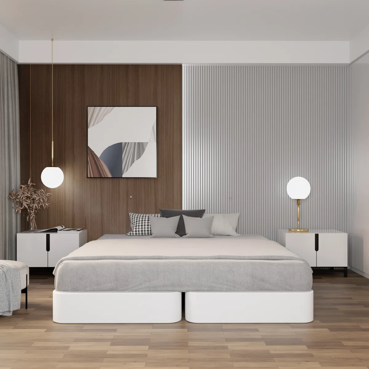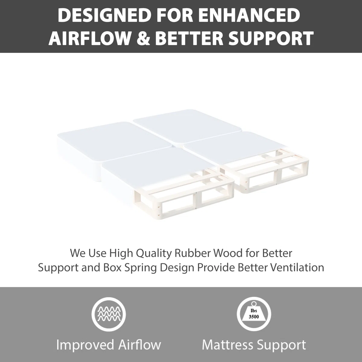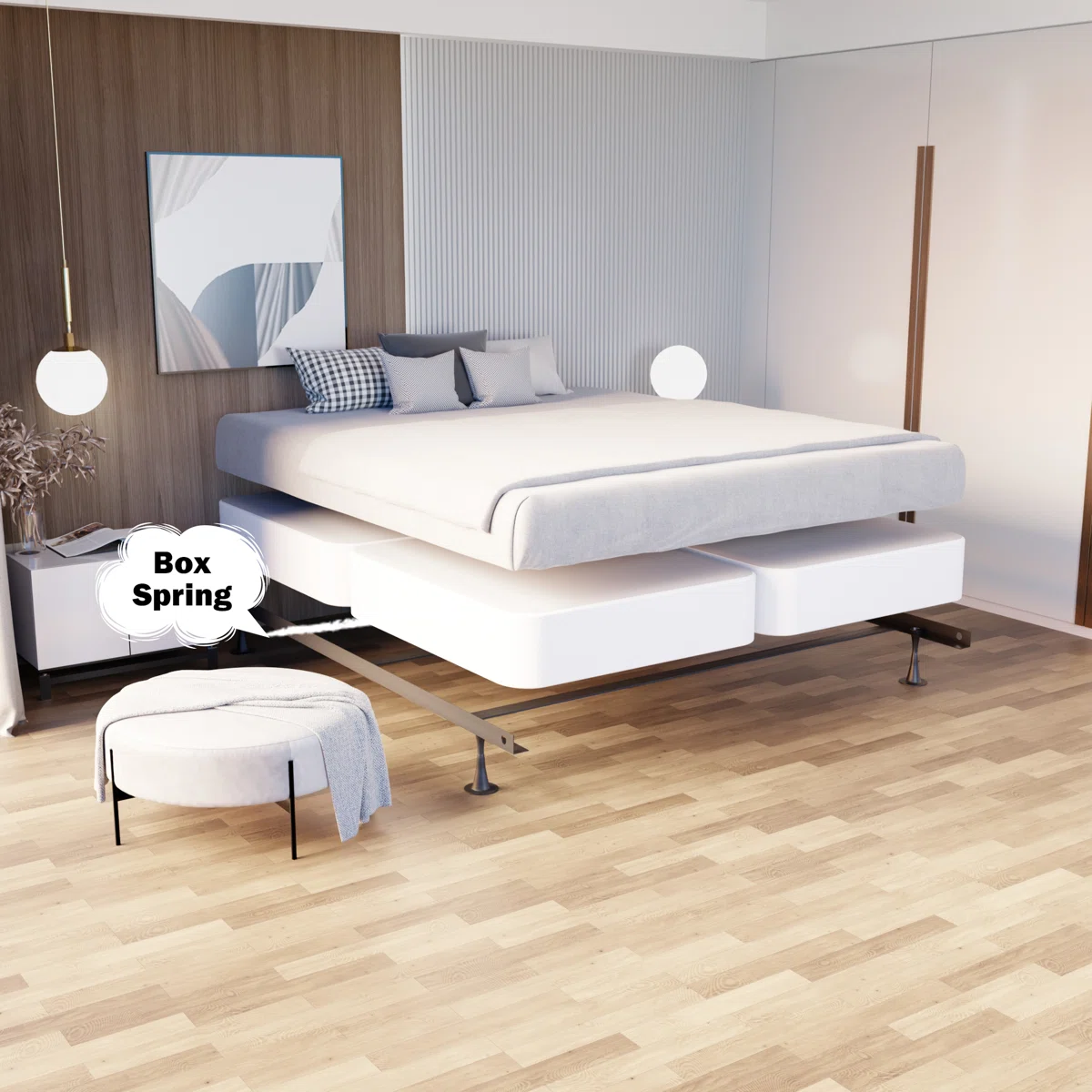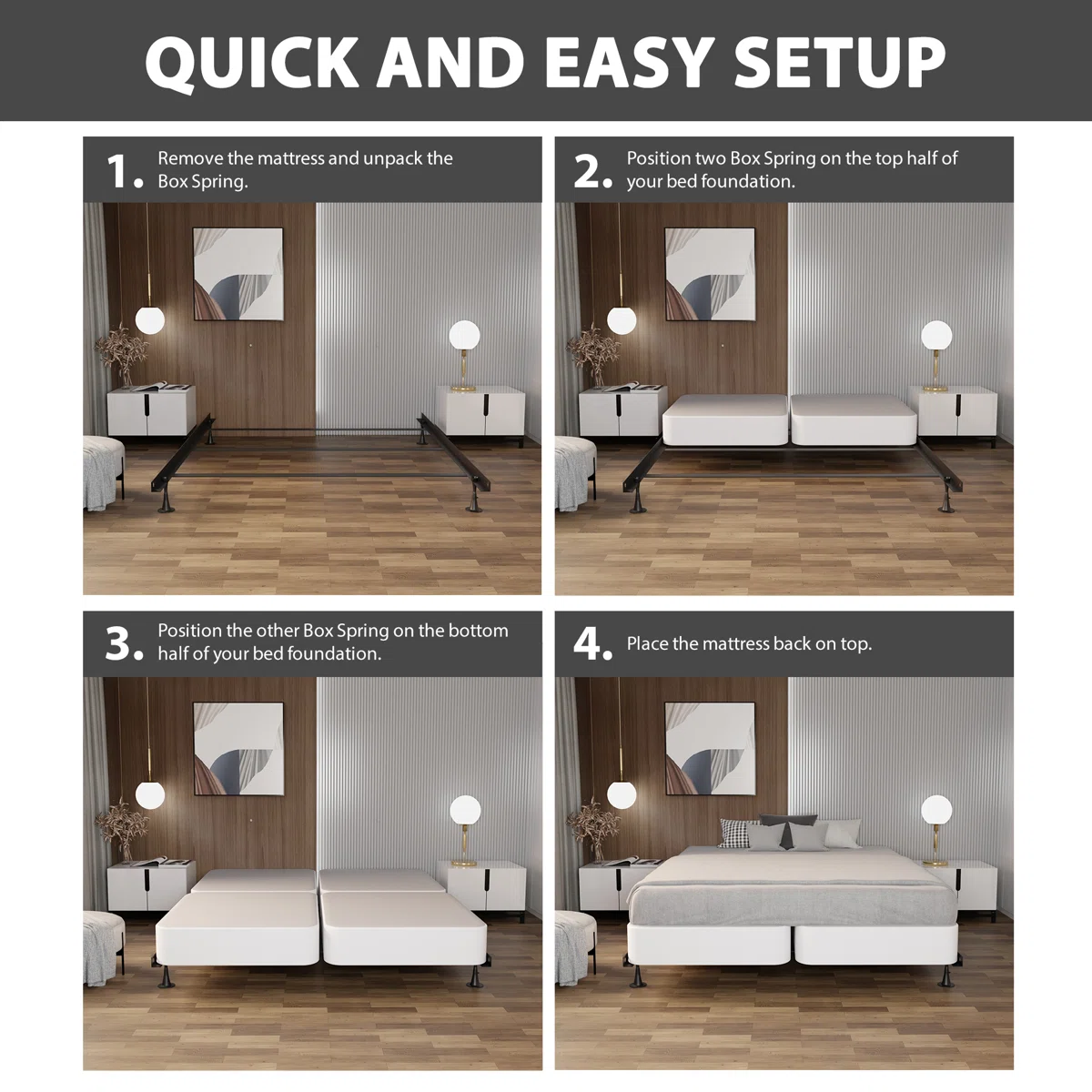 • King-size wooden box spring with 4-piece split design for easy handling