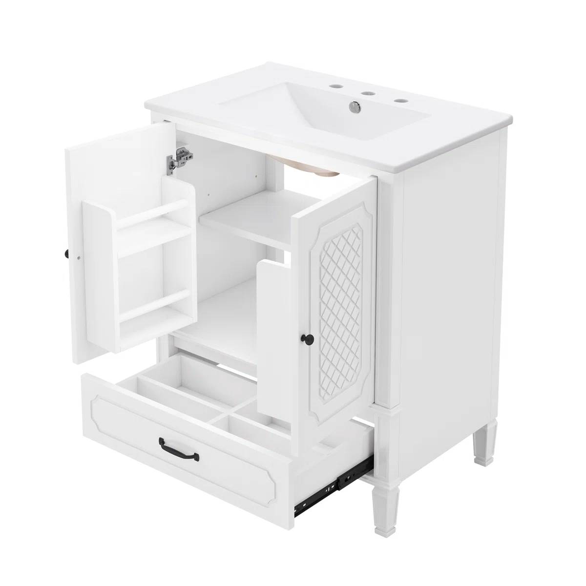 Designed for organized storage, it includes a cabinet with door shelf, an adjustable shelf, and a large drawer with removable panel to create customizable storage zones. Soft-close metal hinges ensure quiet operation, even in humid bathroom environments. The freestanding vanity is easy to assemble, with all hardware and instructions included for quick setup.
